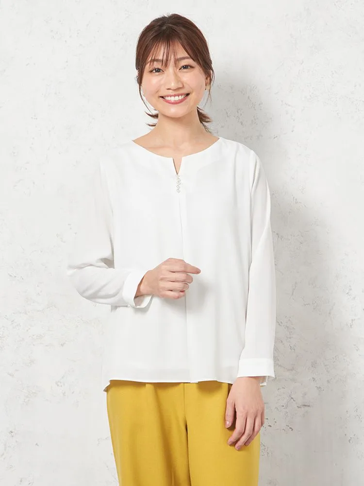 顔まわりをすっきりと見せてくれるキーネックは5連パールをプラス、アクセなしでも華やかに着られます。