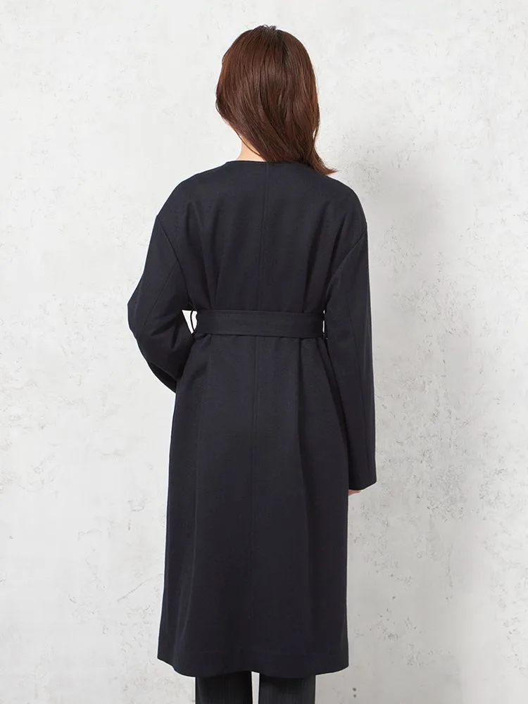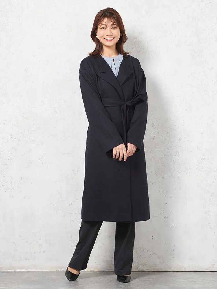 衿元のボタンの留め方でノーカラーorラペル付きに印象チェンジできる2WAY仕様。ウエストベルトでも着方のアレンジを楽しめます。