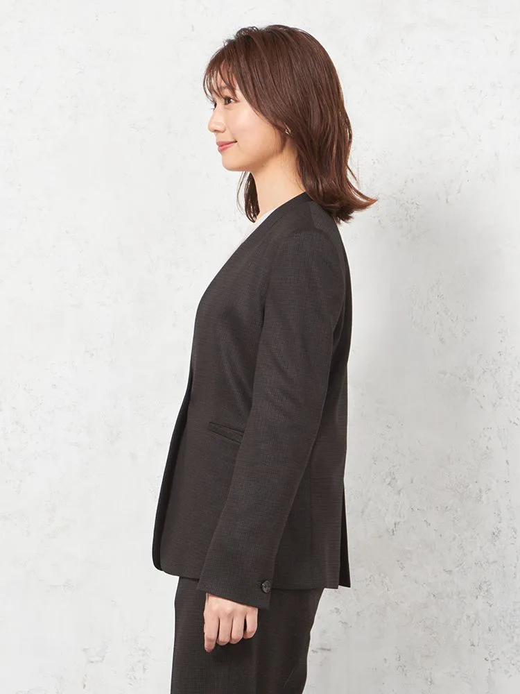 ノーカラーのジャケットはハイネックや衿コンシャスなトップスとも好相性、さりげないシャドウチェック柄が無地にはないおしゃれ心を演出します。