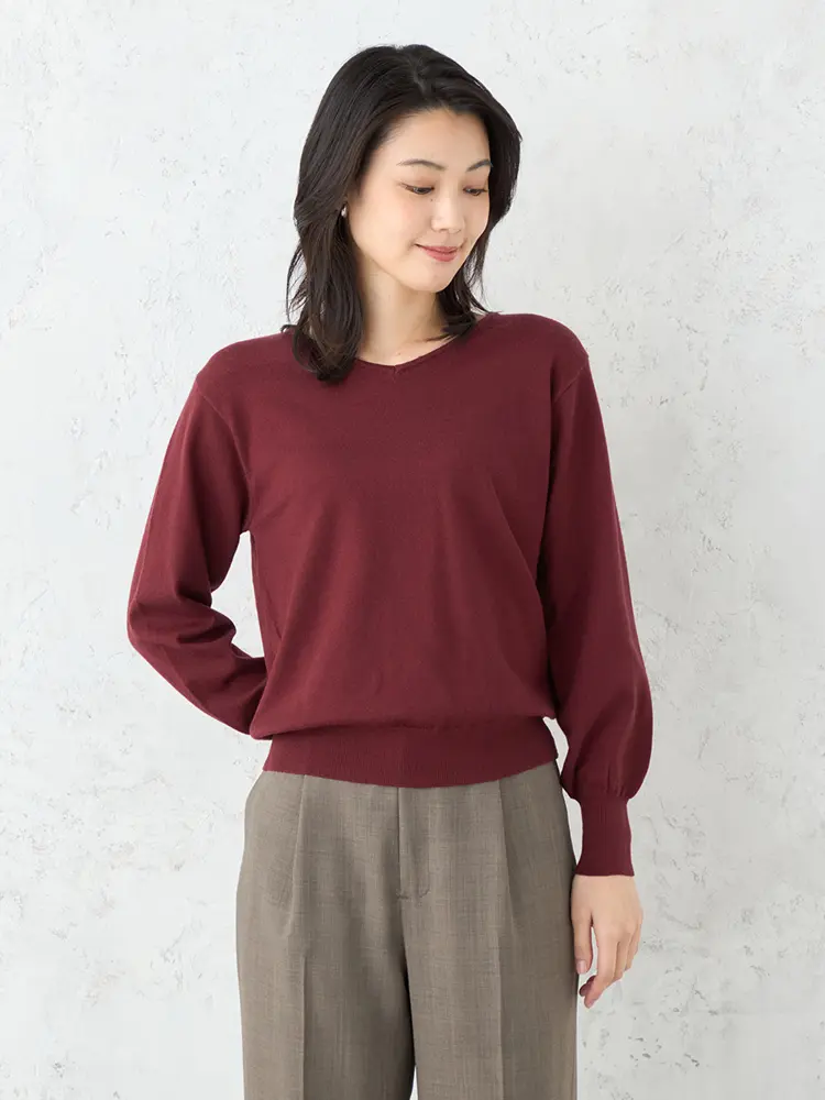 【SOFFICE】抗ピルVネックパフスリーブニット カットソー ウォッシャブル 放電 抗ピリング 秋冬
