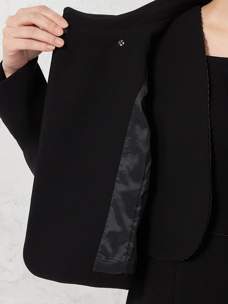 ロールカラージャケットと身頃部分にボレロをセットしたワンピースを組み合わせたアンサンブルです。