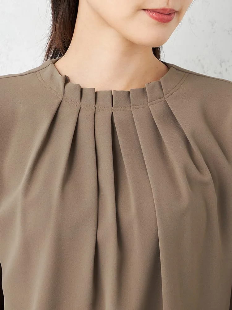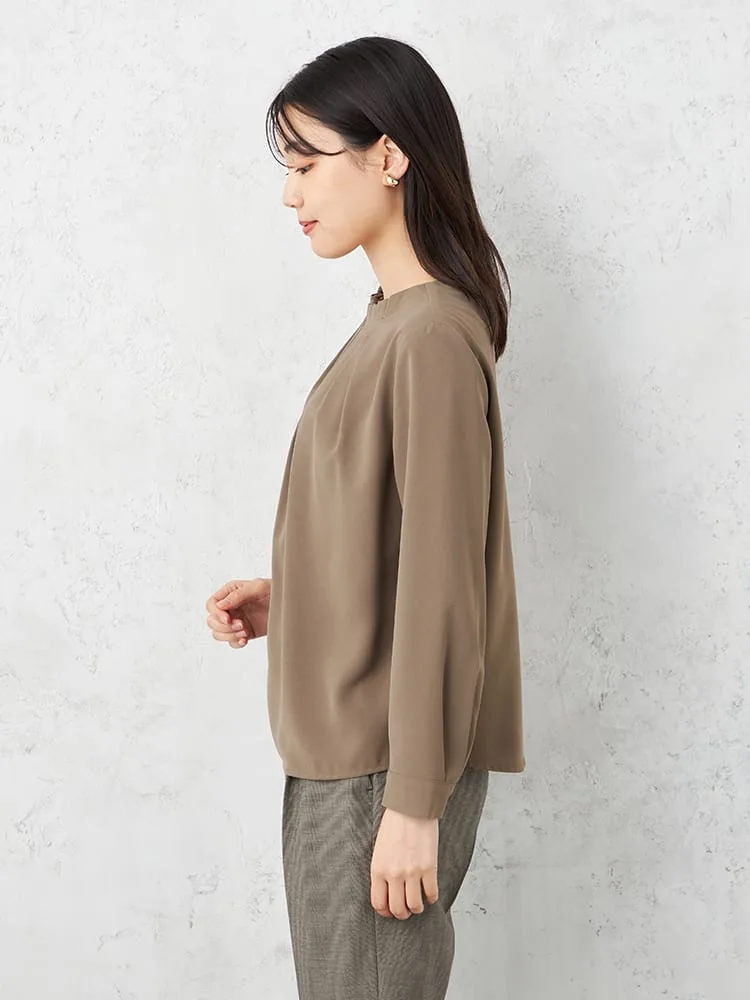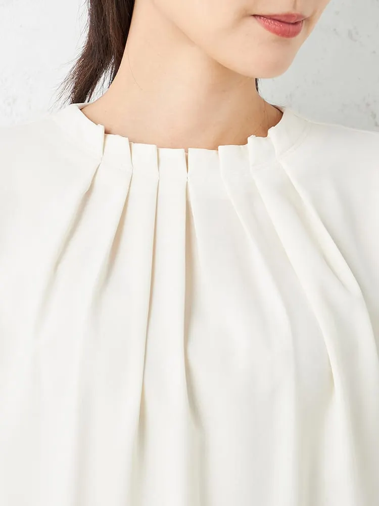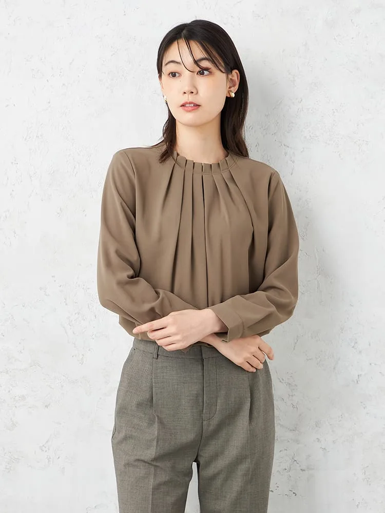 衿のタックデザインにこだわった主役級のブラウスで、ジャケットインはもちろん、1枚でも着映えします。