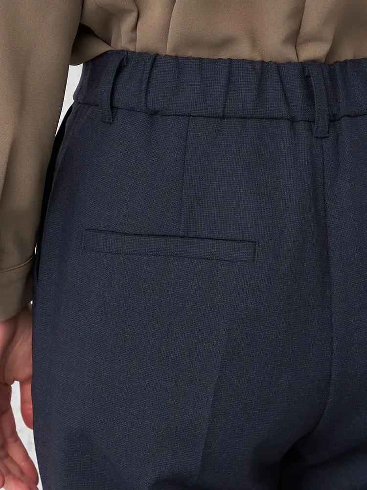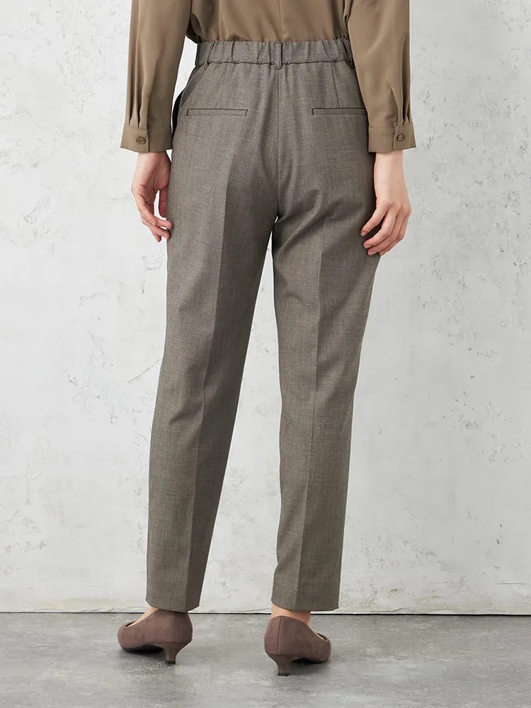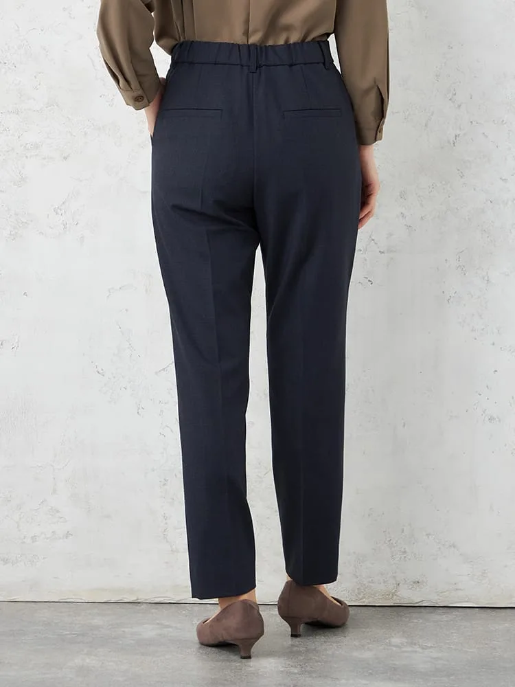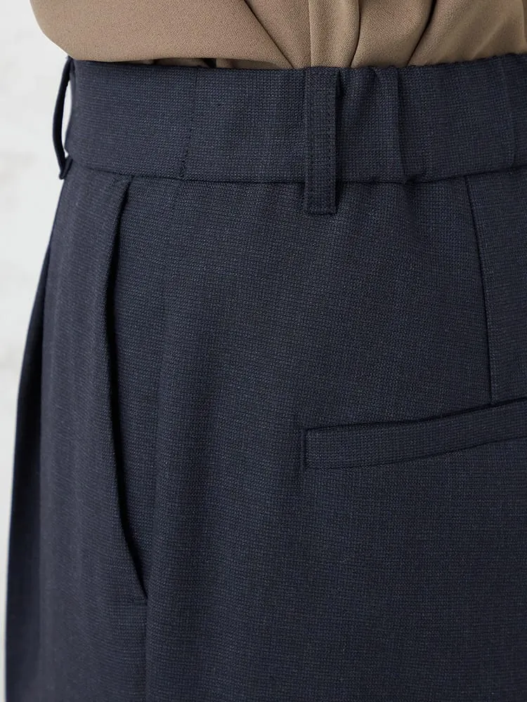 シルエットはキレイ目タックテーパード型で、ウエストはゴム履きですが前にギャザーが寄らないのできちんと感がありながら着脱が楽で快適な着用感です。