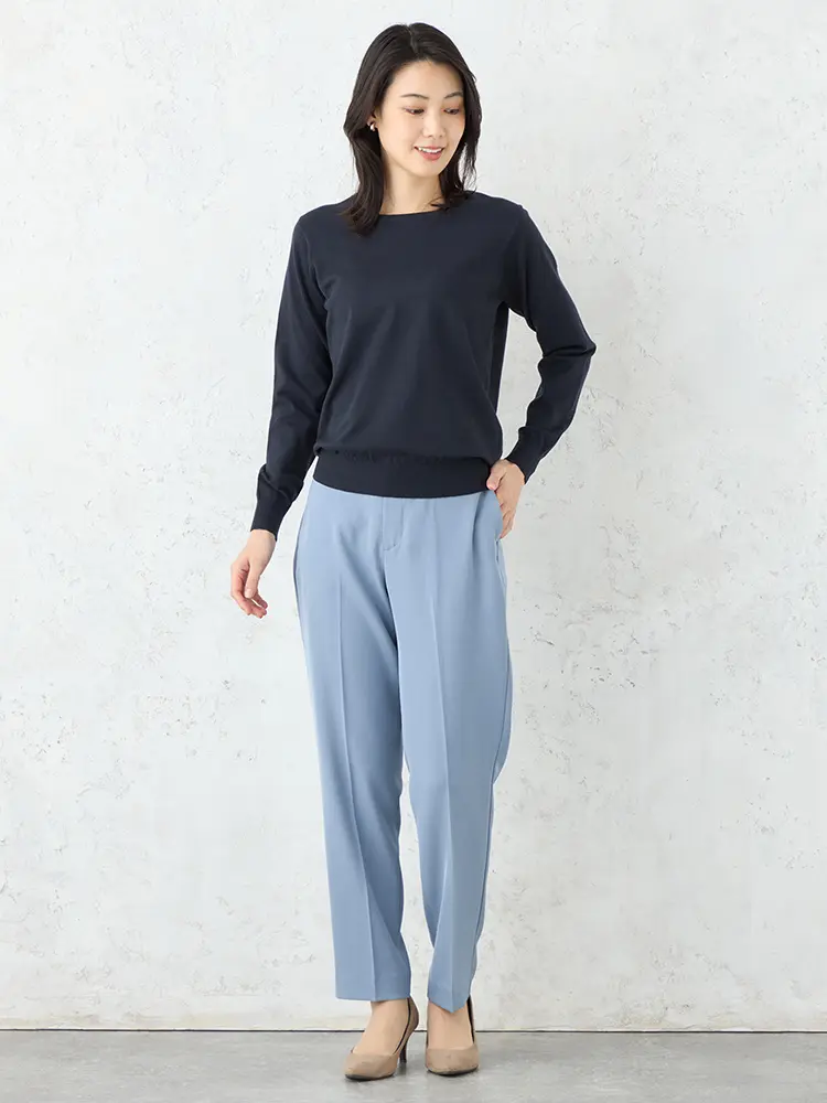 程よくフィット感のあるシルエットで、ジャケットやコートを羽織ってもモタつきにくいのが特徴。