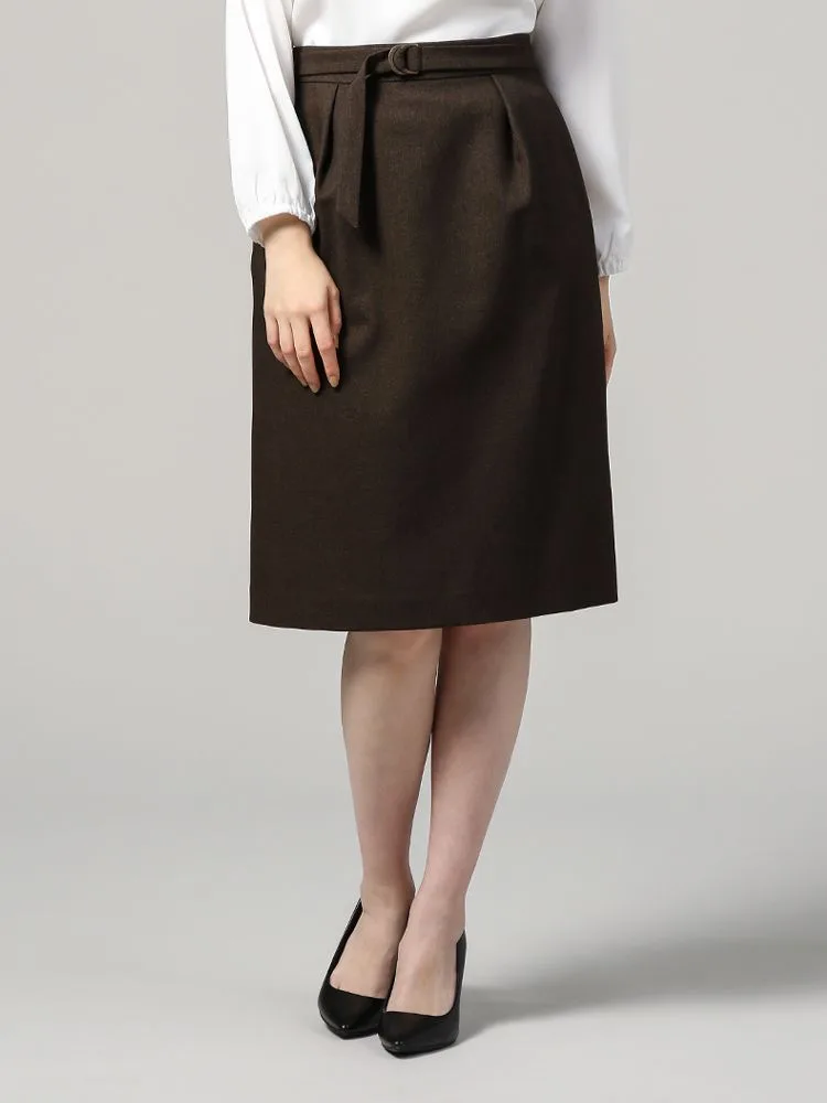 【ウォッシャブル】膝丈タイトスカートウールライクストレッチ抗菌裏地ベルト付きダークブラウンSOFFICE秋冬【レディース】