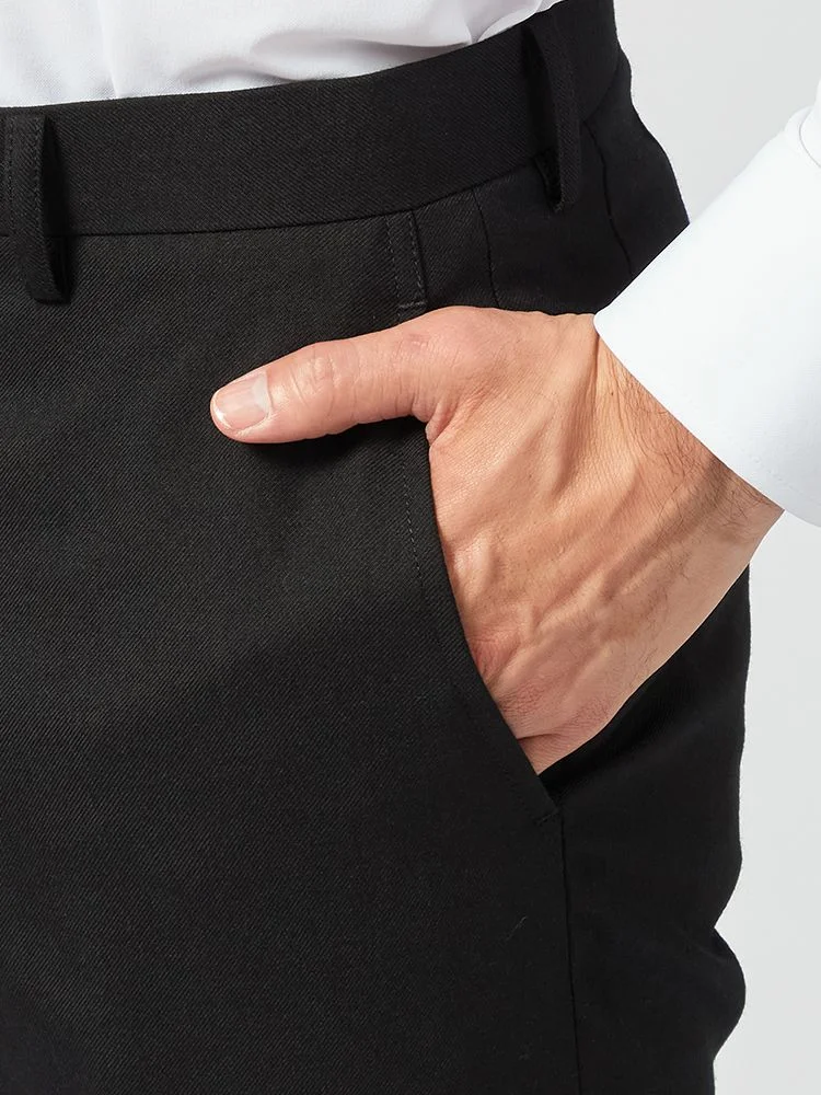 パンツの腰回りに生地の折り込みがなく、スッキリとしたシルエットを実現します。シンプルで洗練された印象を与え、すっきりとした着こなしが可能です。