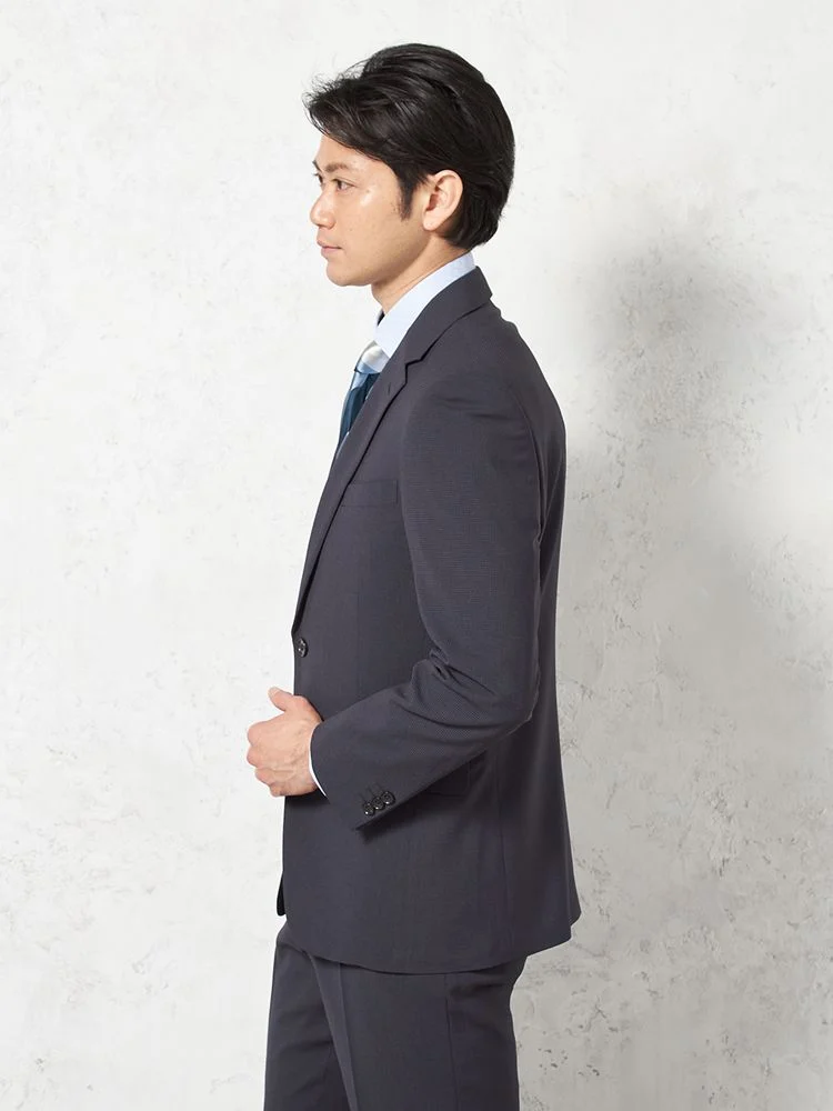 切り込みが1本のセンターベントデザインです。細身でスッキリとしたシルエットが特徴で、快適な着心地を提供します