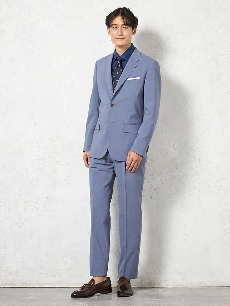 春夏の装いに取り入れたい、清涼感のあるサックスカラーのスーツ。