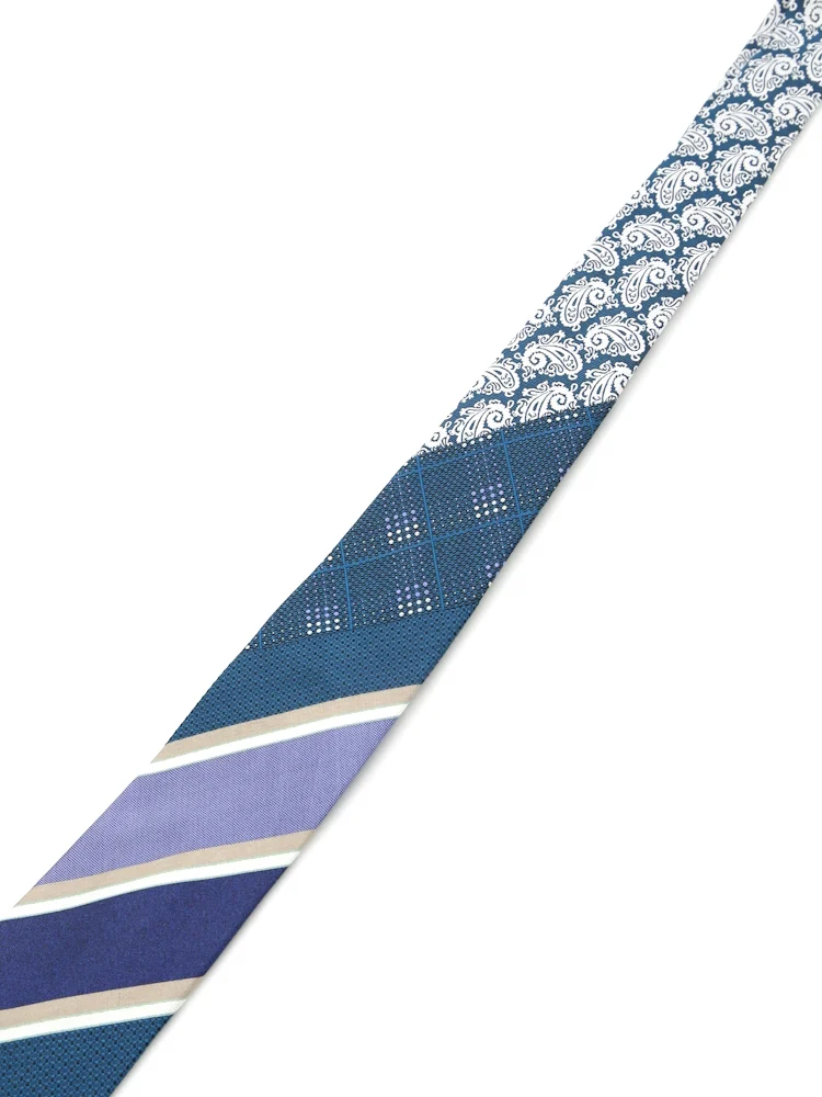 三種のシルク生地を縫い合わせて一枚の生地に仕上げたクレイジーパターンネクタイです。