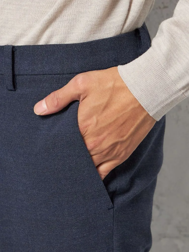 パンツの腰回りに生地の折り込みがなく、スッキリとしたシルエットを実現します。シンプルで洗練された印象を与え、すっきりとした着こなしが可能です。