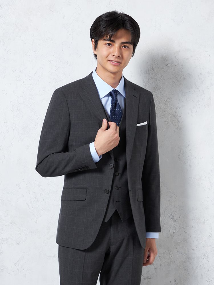 エレガントな表情のセレモニーシーンに好適な美光沢素材を使用したスリーピーススーツ。