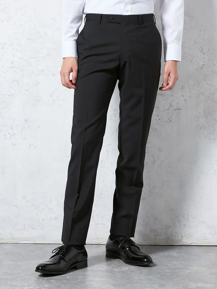 洗練されたな着こなしに仕上がるブラック×ストライプのスリーピーススーツ。