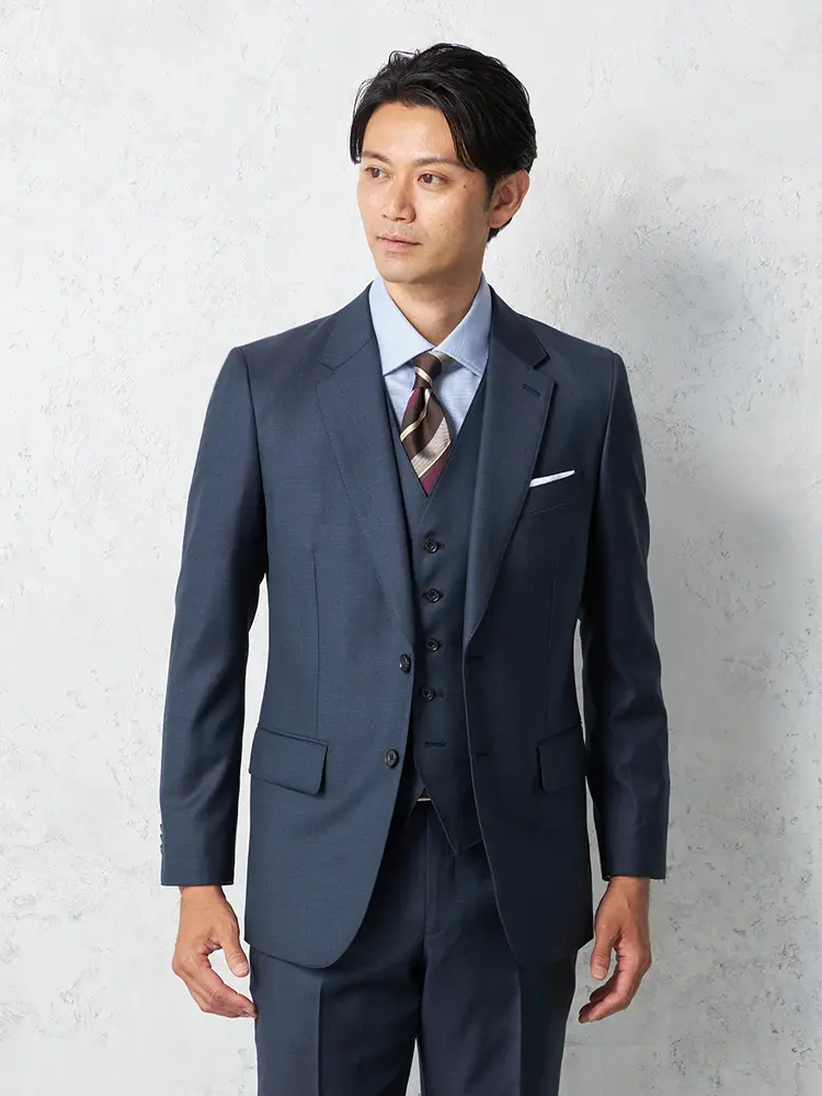ジャケット、パンツ、ベストの3点セットで、スーツ全体を簡単にコーディネートできます。ビジネスやフォーマルな場面に最適です。