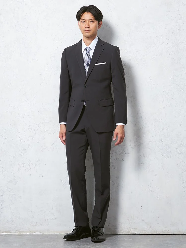 【即納】スーツ2つボタン【WEB限定】4WAYストレッチ織柄チャコールグレー通年