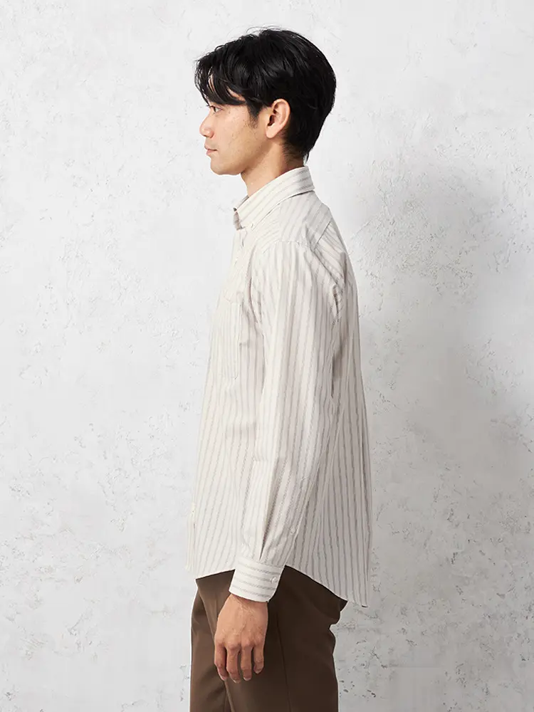 無地にはないおしゃれな雰囲気ただようストライプ柄の綿100% ビジカジシャツは、遠目にも存在感を発揮します。