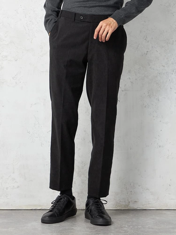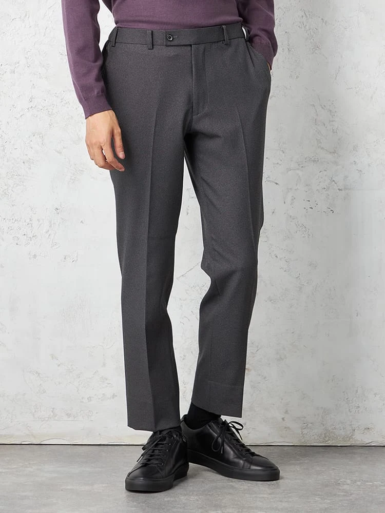 パンツの腰回りに生地の折り込みがなく、スッキリとしたシルエットを実現します。シンプルで洗練された印象を与え、すっきりとした着こなしが可能です。