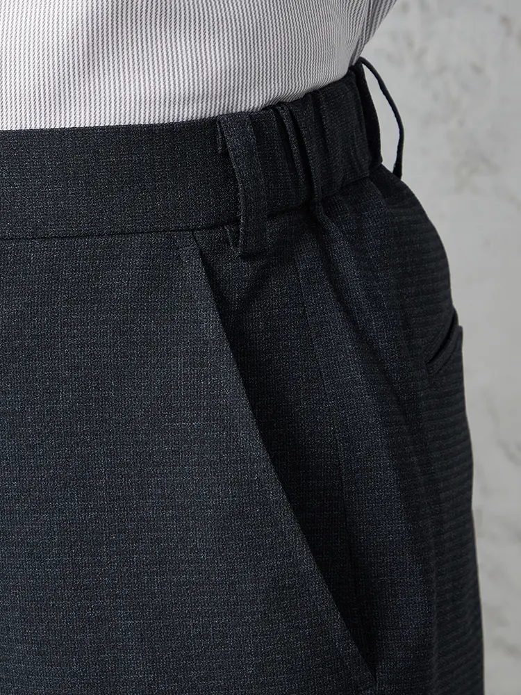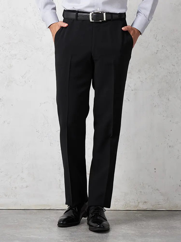 パンツの腰回りに生地の折り込みがなく、スッキリとしたシルエットを実現します。シンプルで洗練された印象を与え、すっきりとした着こなしが可能です。