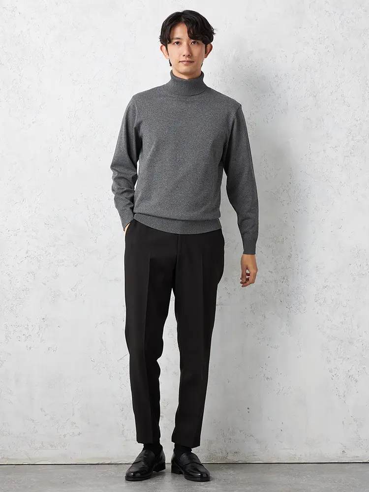 視覚的なあたたかさも兼ね備えるタートルネックが、シルエットの美しさを際立たせるアイテムです。