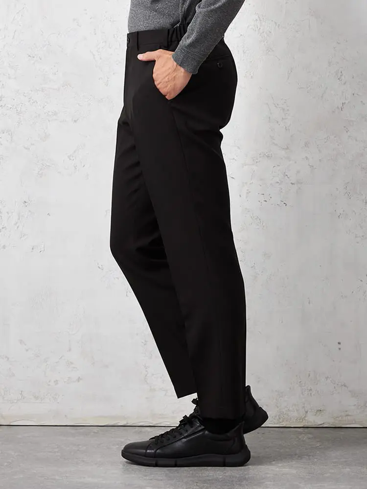 パンツの腰回りに生地の折り込みがなく、スッキリとしたシルエットを実現します。シンプルで洗練された印象を与え、すっきりとした着こなしが可能です。