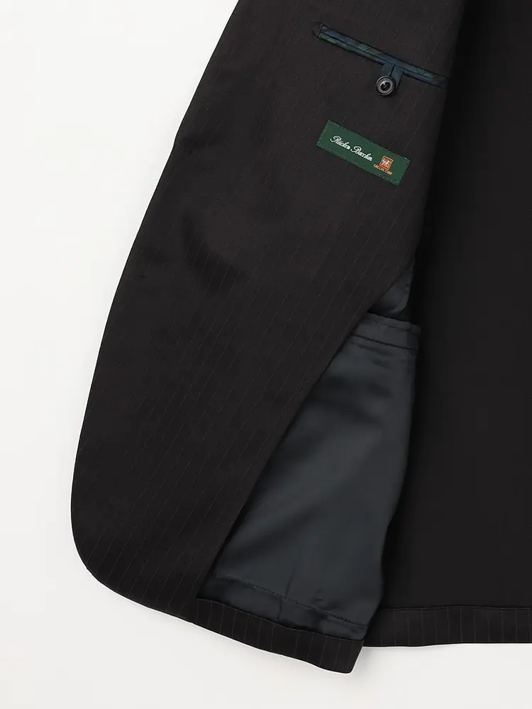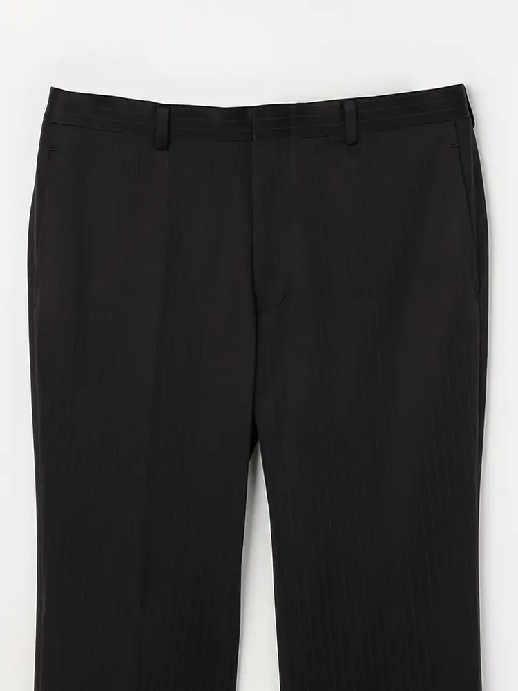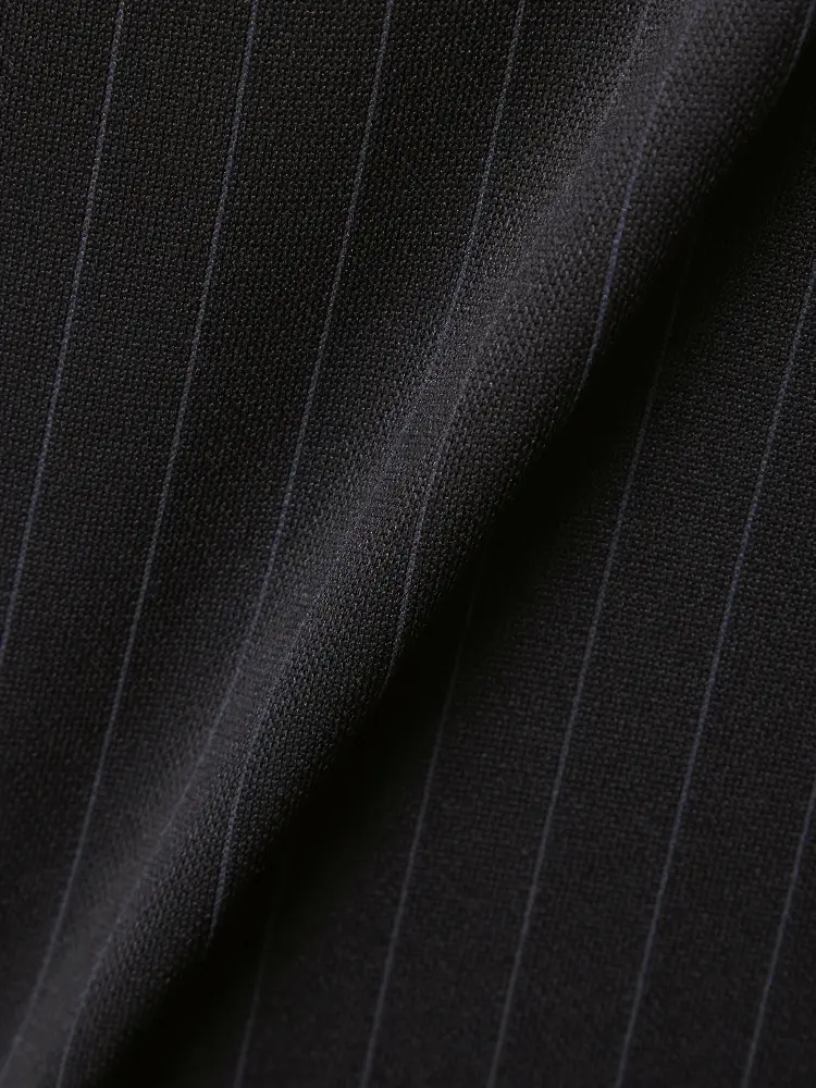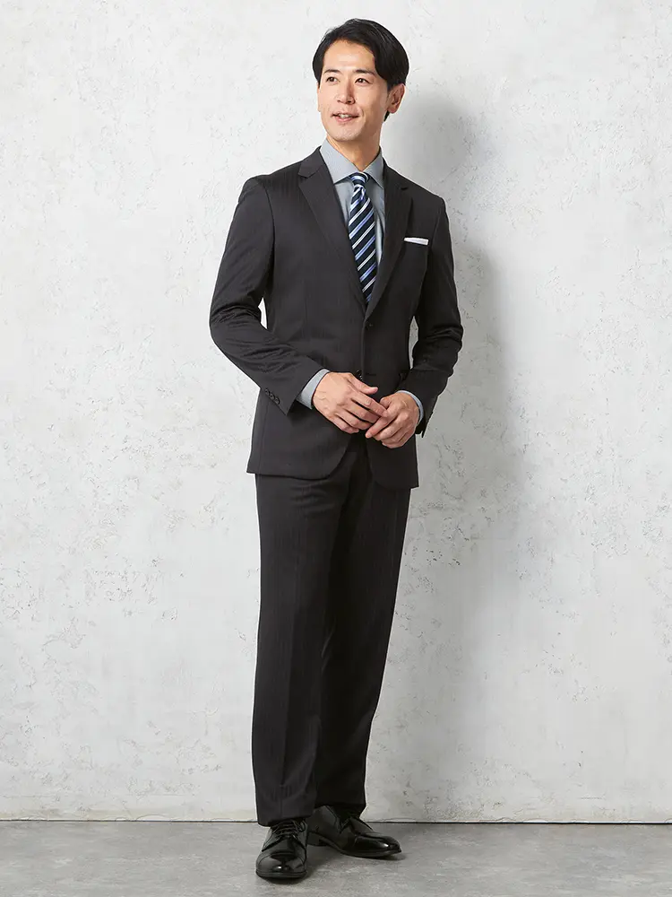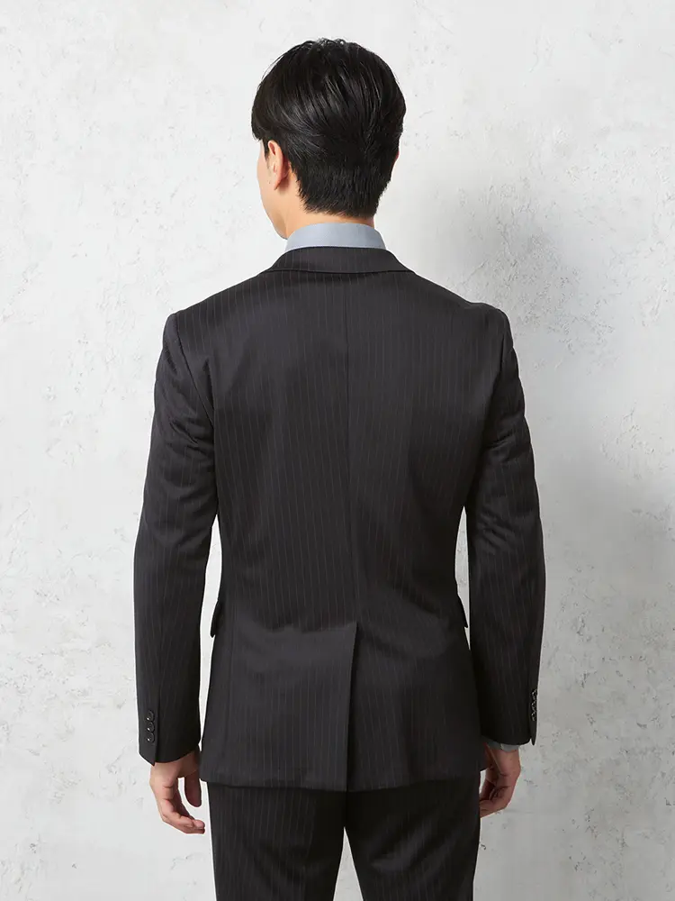 繊細なストライプが着こなしを引き締めるセンターベントのノータックスーツ。