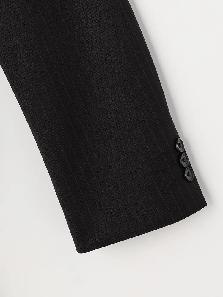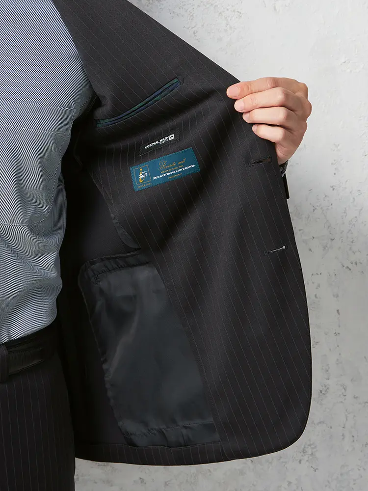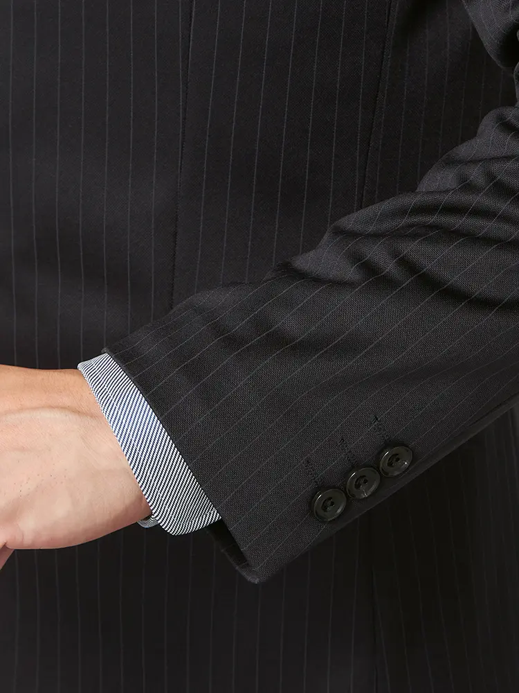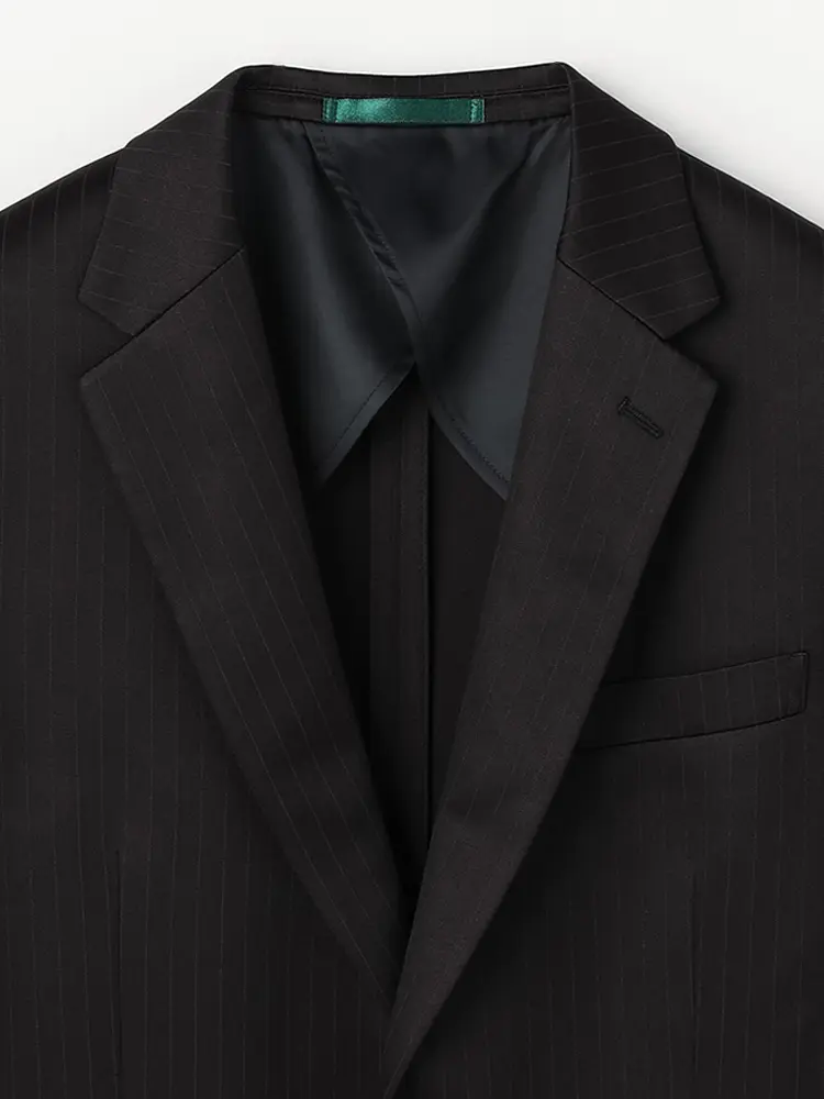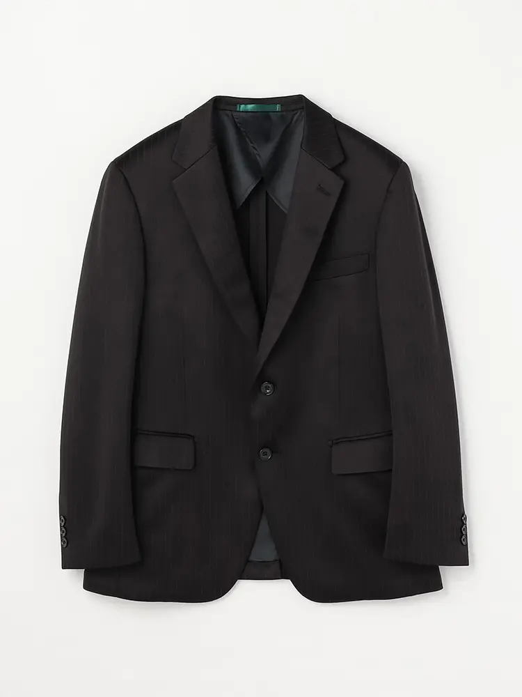 繊細なストライプが着こなしを引き締めるセンターベントのノータックスーツ。