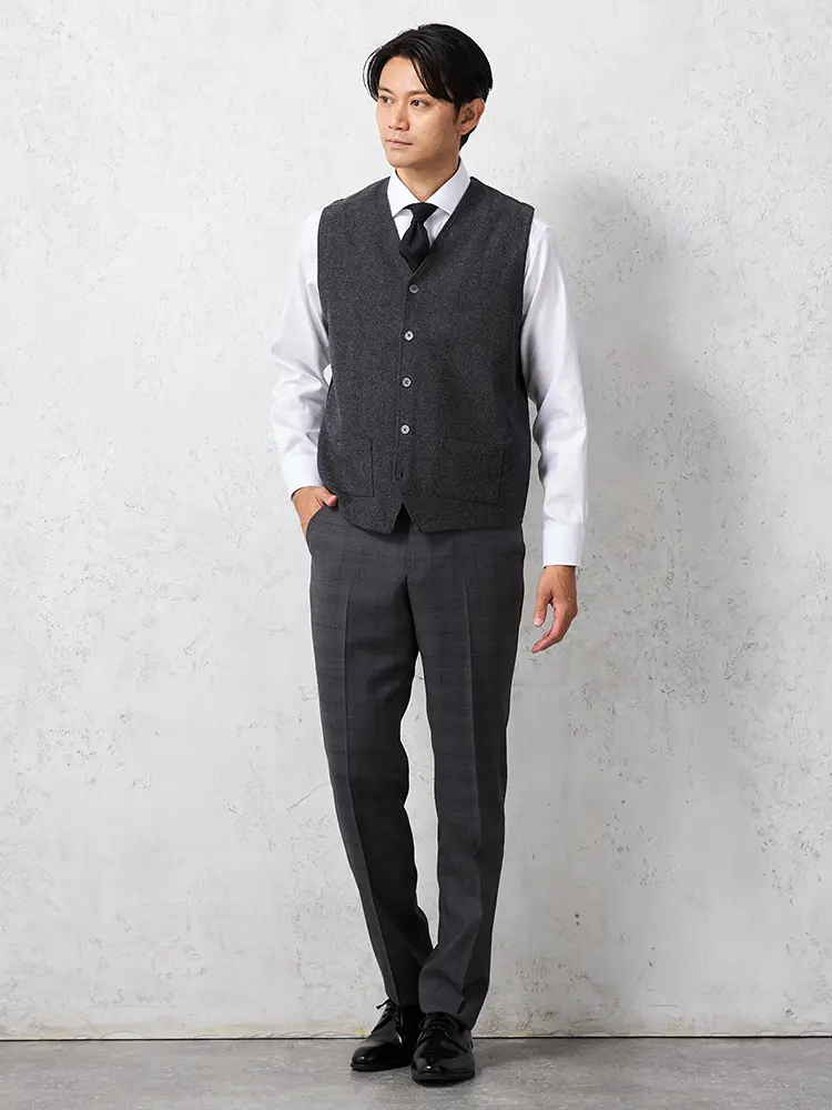 着こなしをエレガントに引き締めるウール混素材のシンプルでクラシカルなベストです。