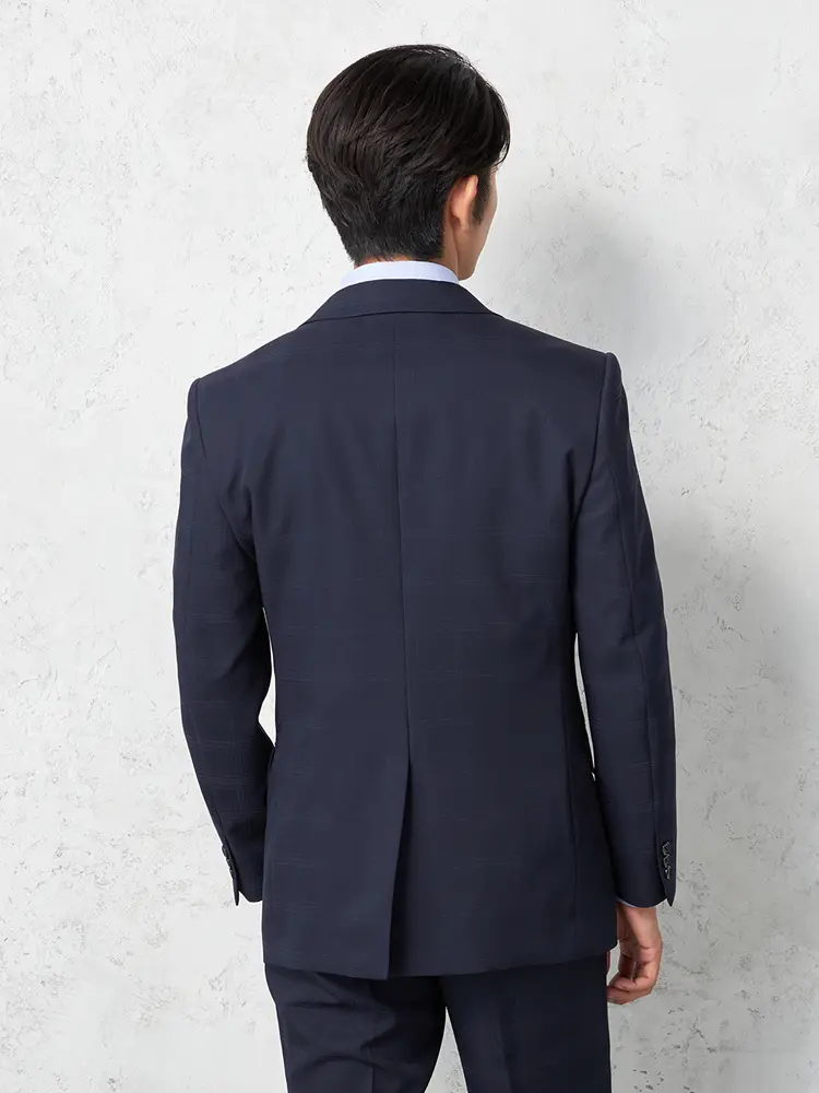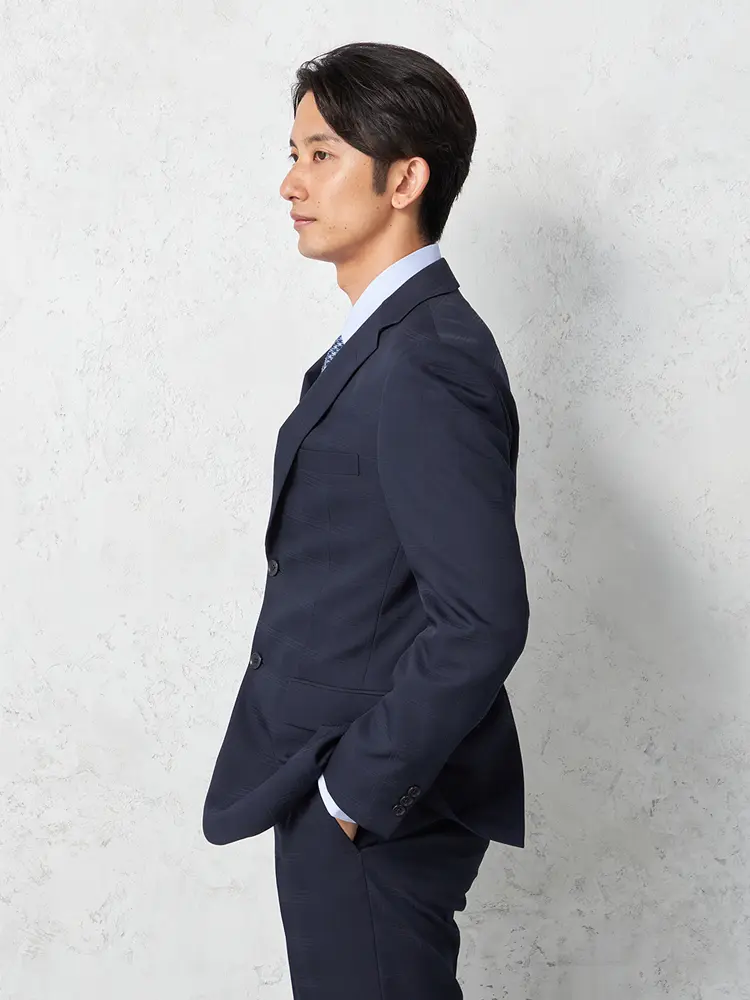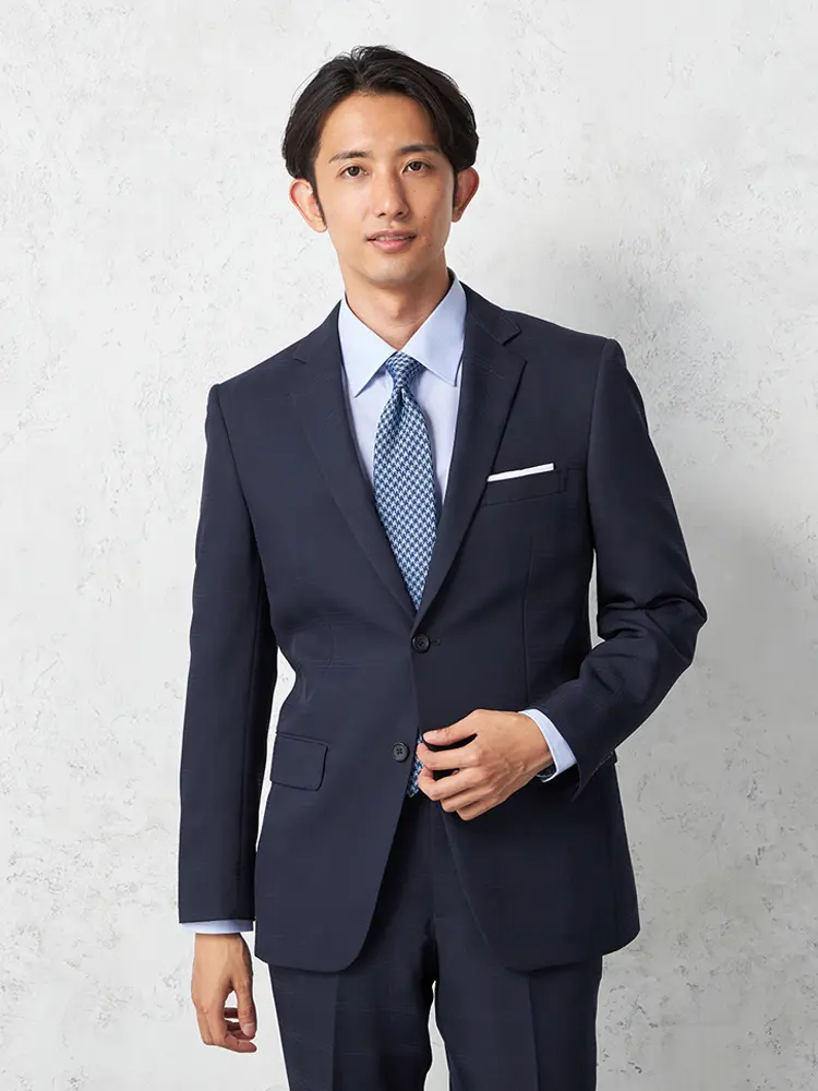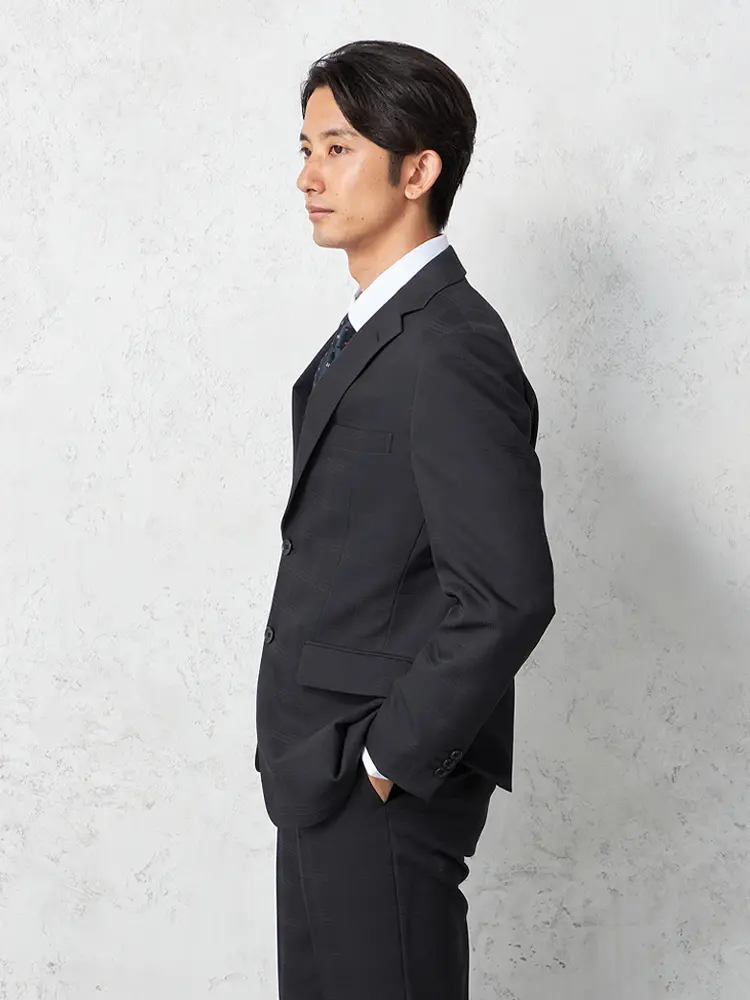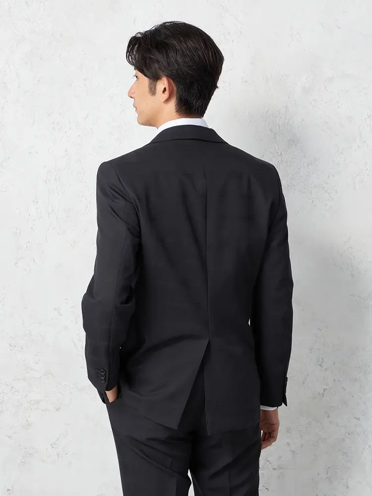 織りの変化によってチェック柄がさりげなく表現された上下ウォッシャブルのスーツ。