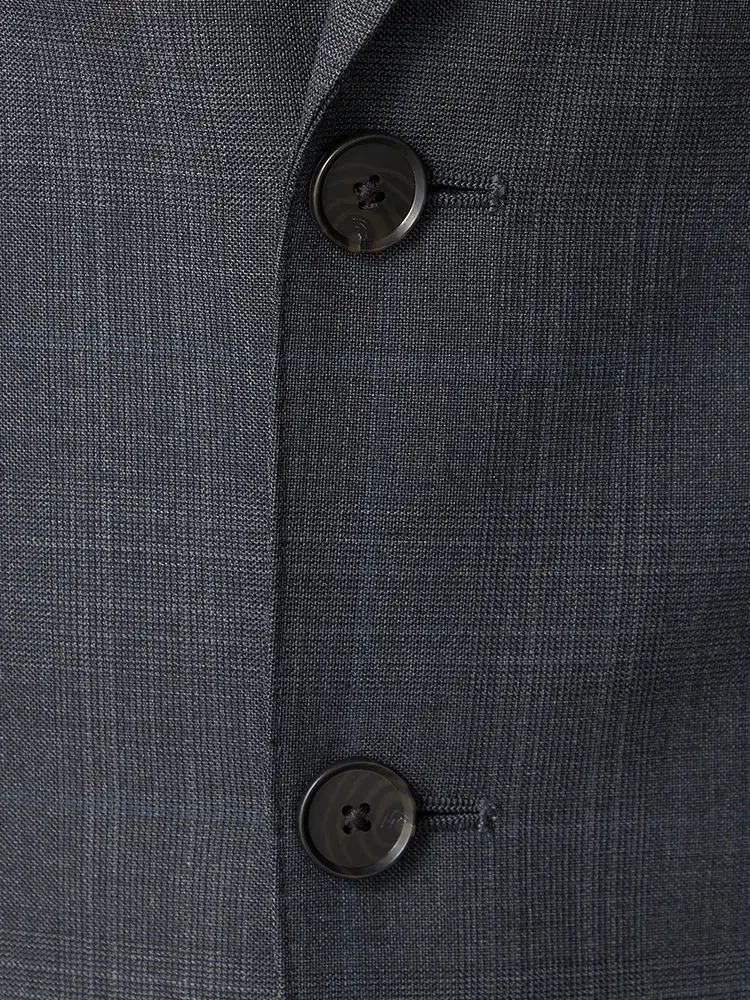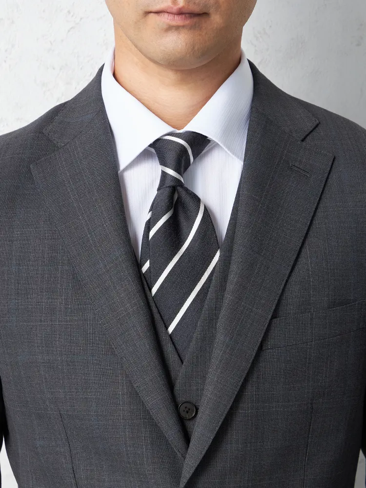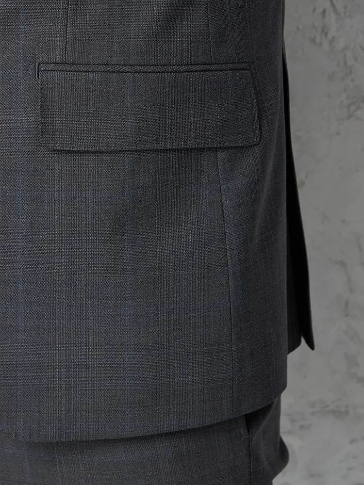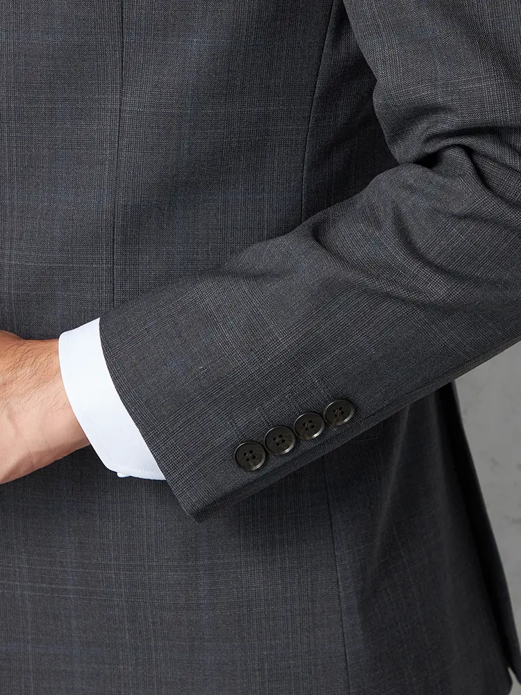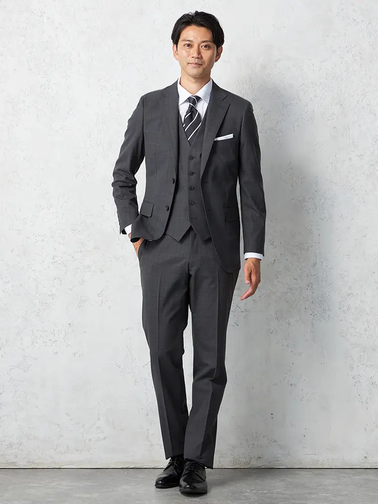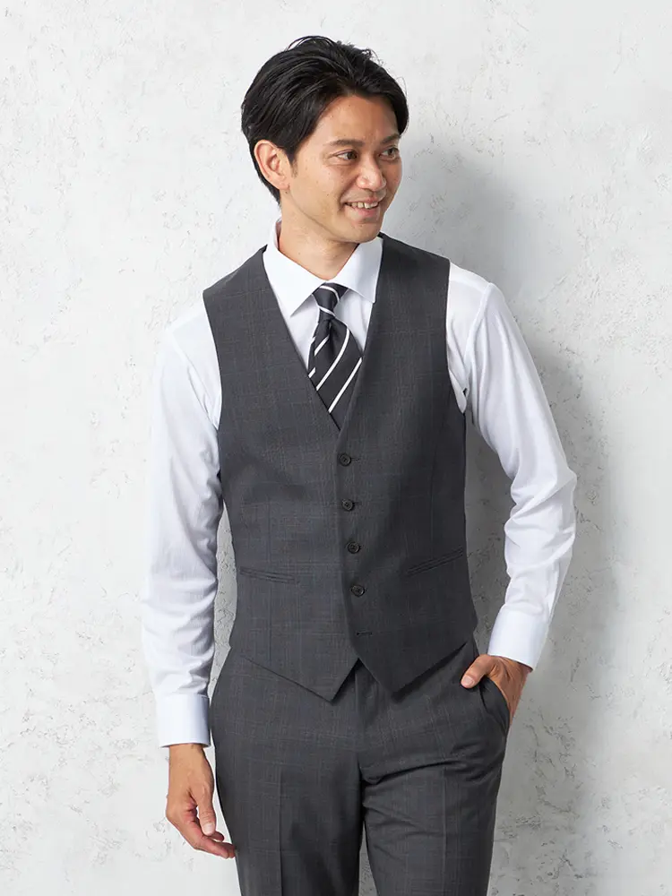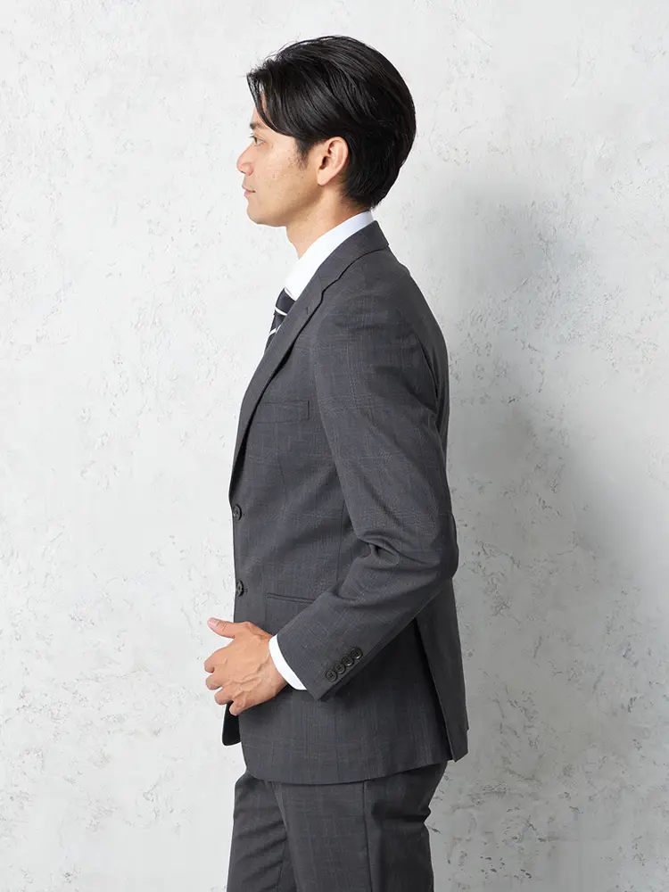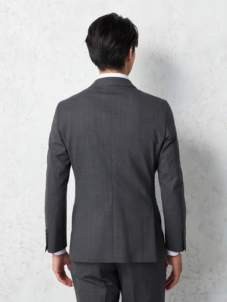 サイドベンツ背抜き仕立てのトラッド感あふれるグレンチェック柄のスリーピーススーツ。