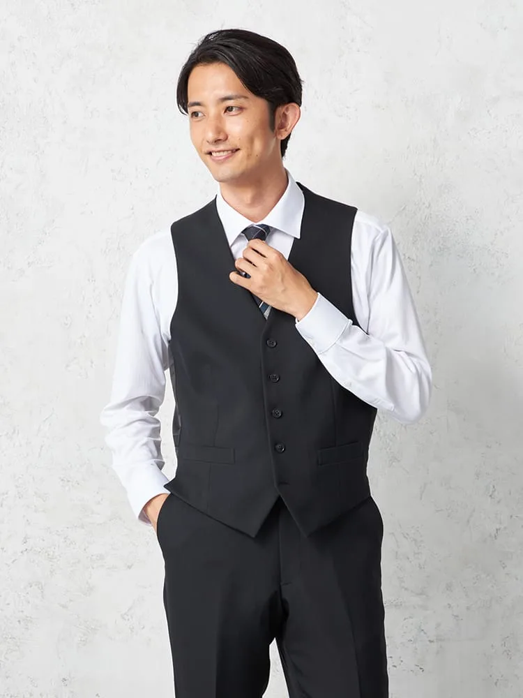 ベストが付いた3ピース仕様で、様々な着こなしをお楽しみいただけます。