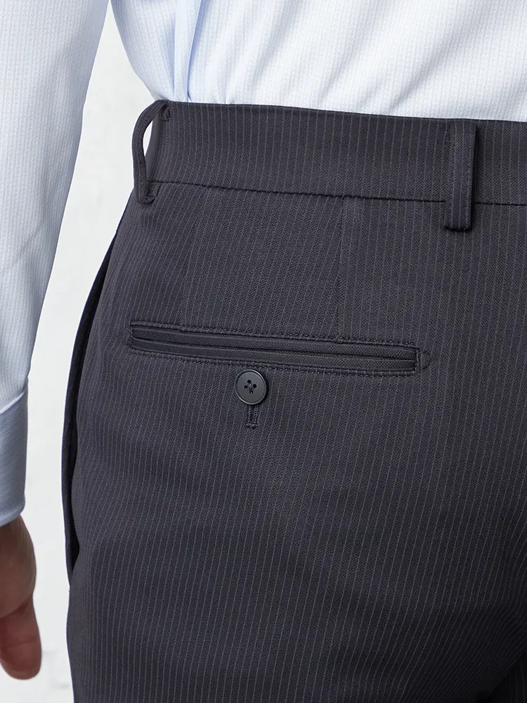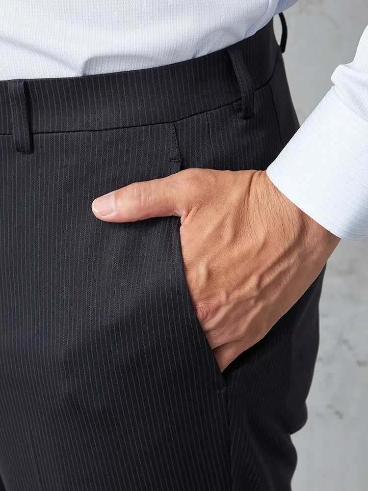 ノータックの腰回りに細ストライプの柄で、スマートな印象に穿きこなせるニット素材のウォッシャブル仕様のパンツ。