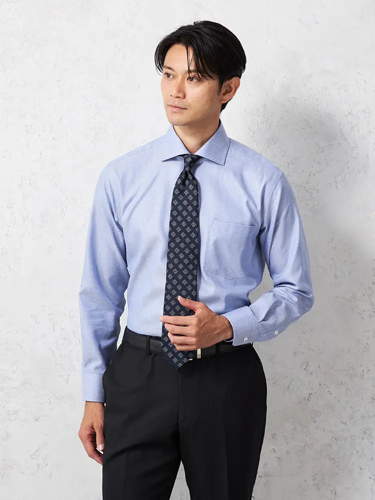 タイドアップもノータイも美しく決まるモダンなセミワイドカラー仕様。