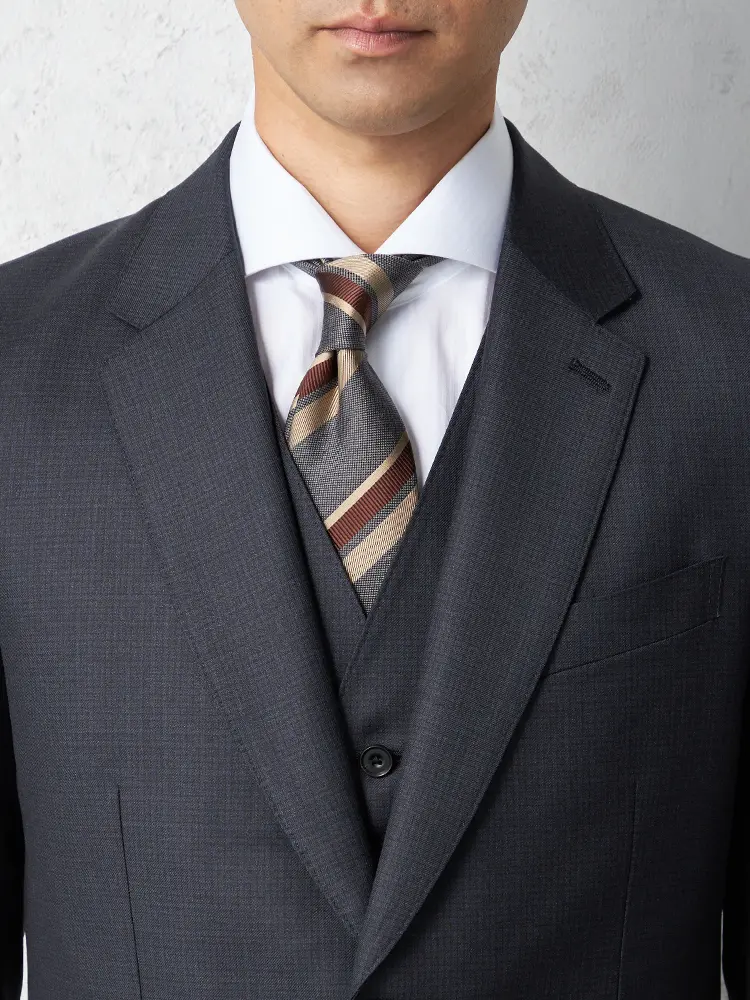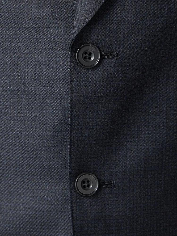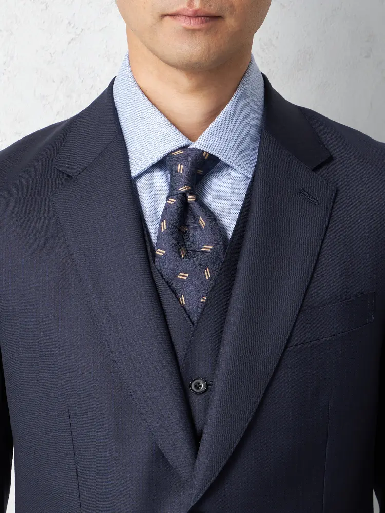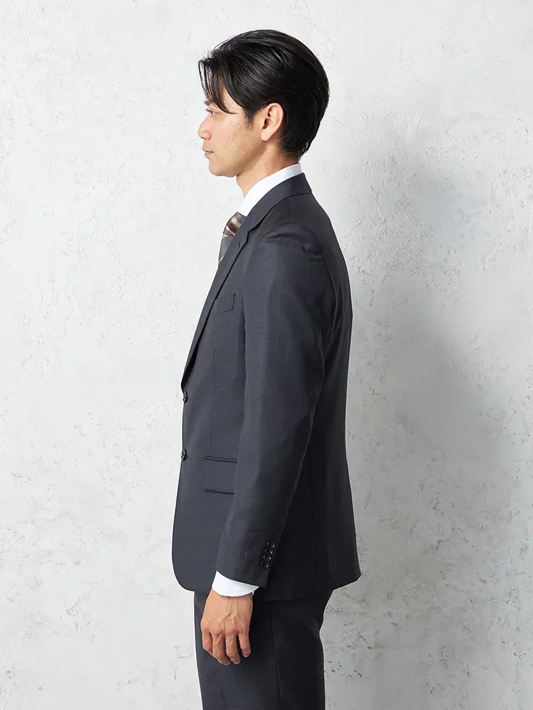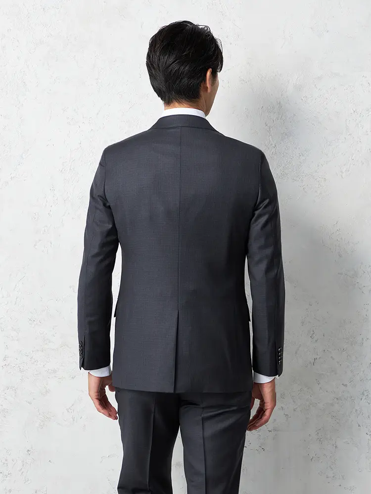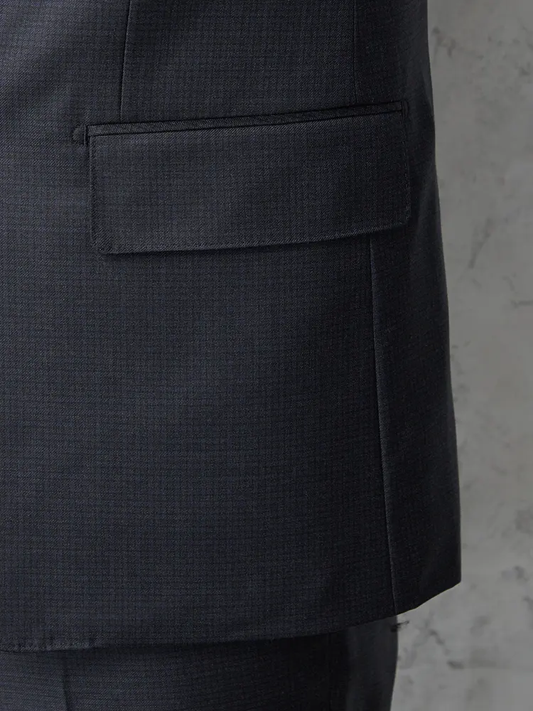 細かなチェック柄がさりげなくデザインされたセンターベントのノータックスリーピーススーツ。