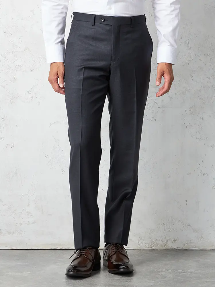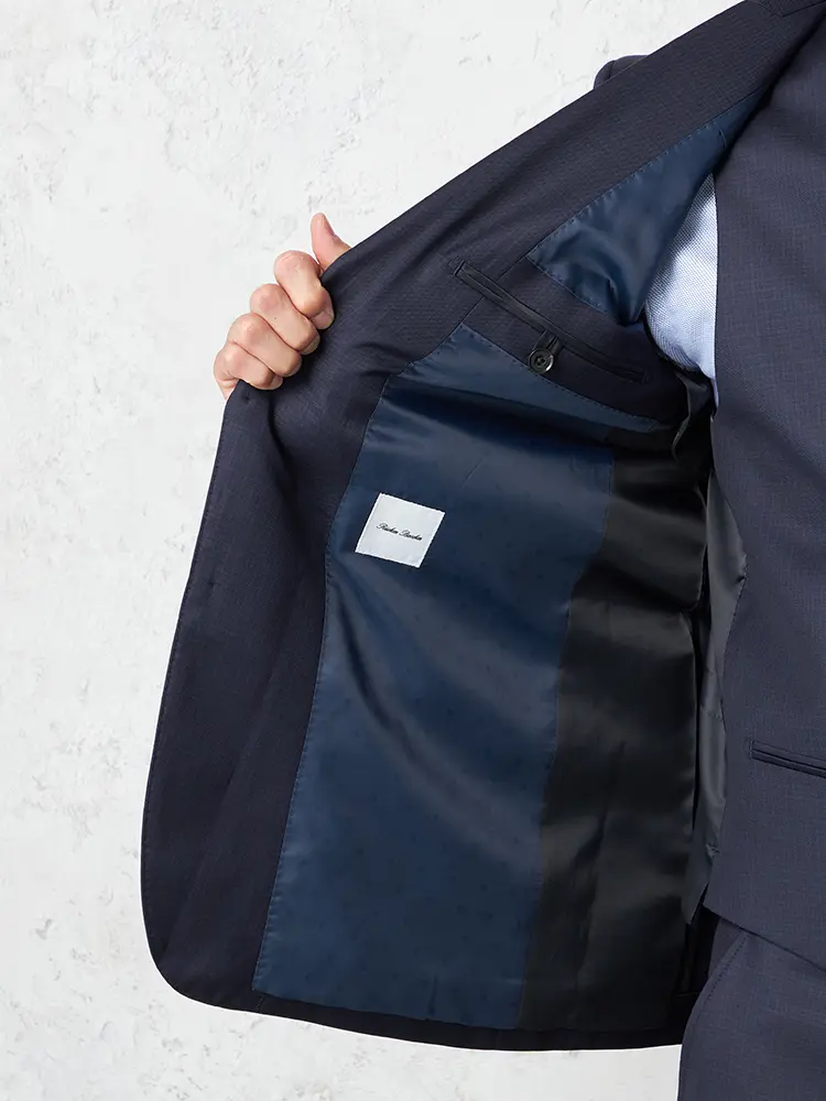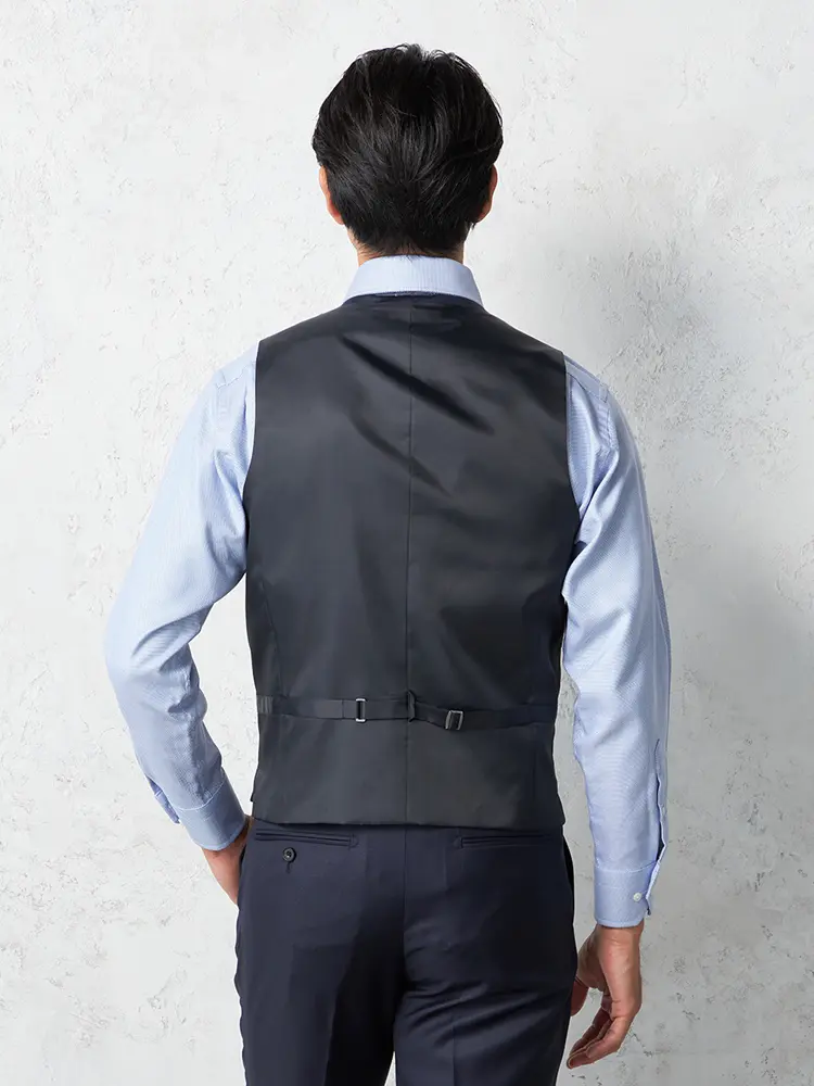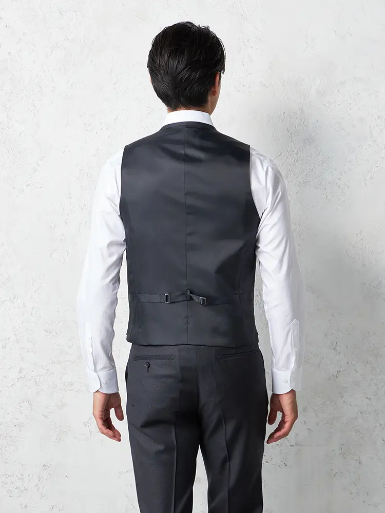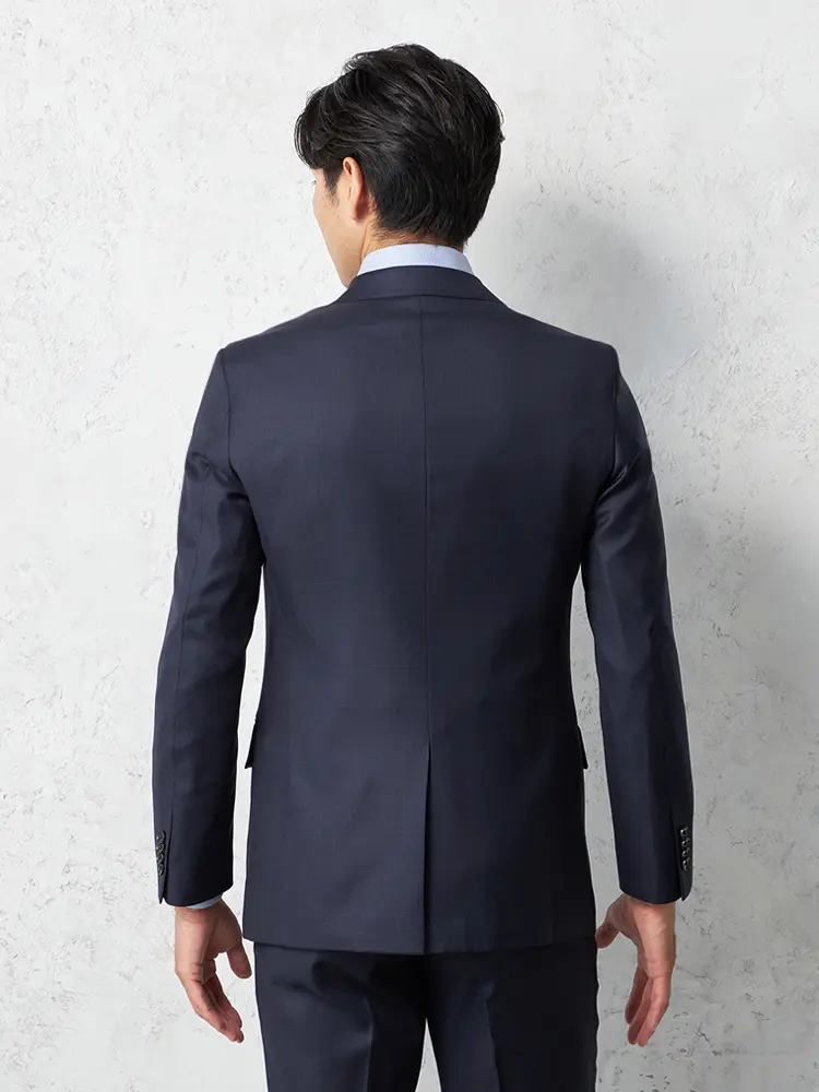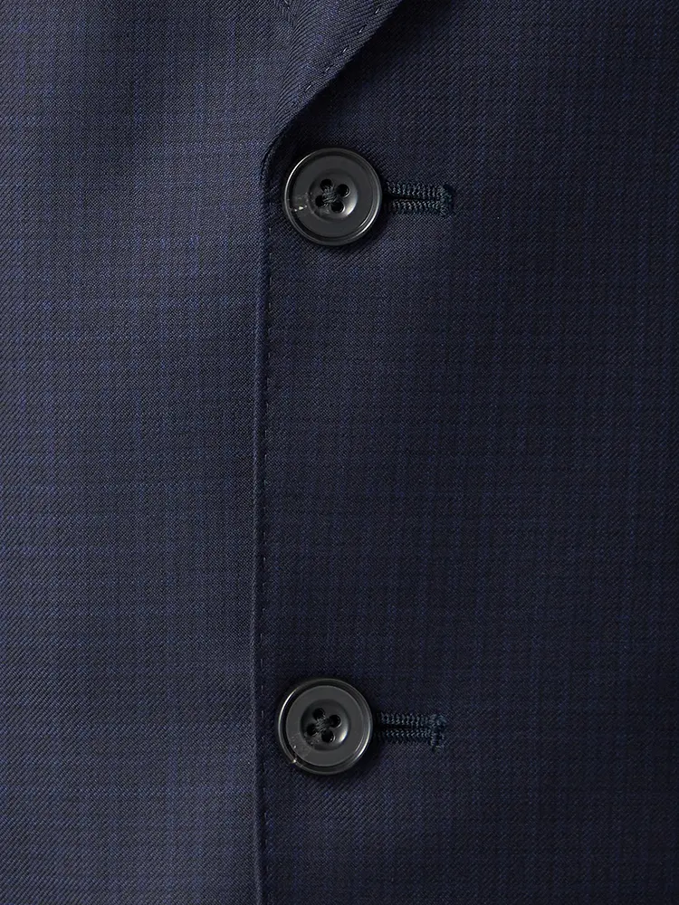 細かなチェック柄がさりげなくデザインされたセンターベントのノータックスリーピーススーツ。