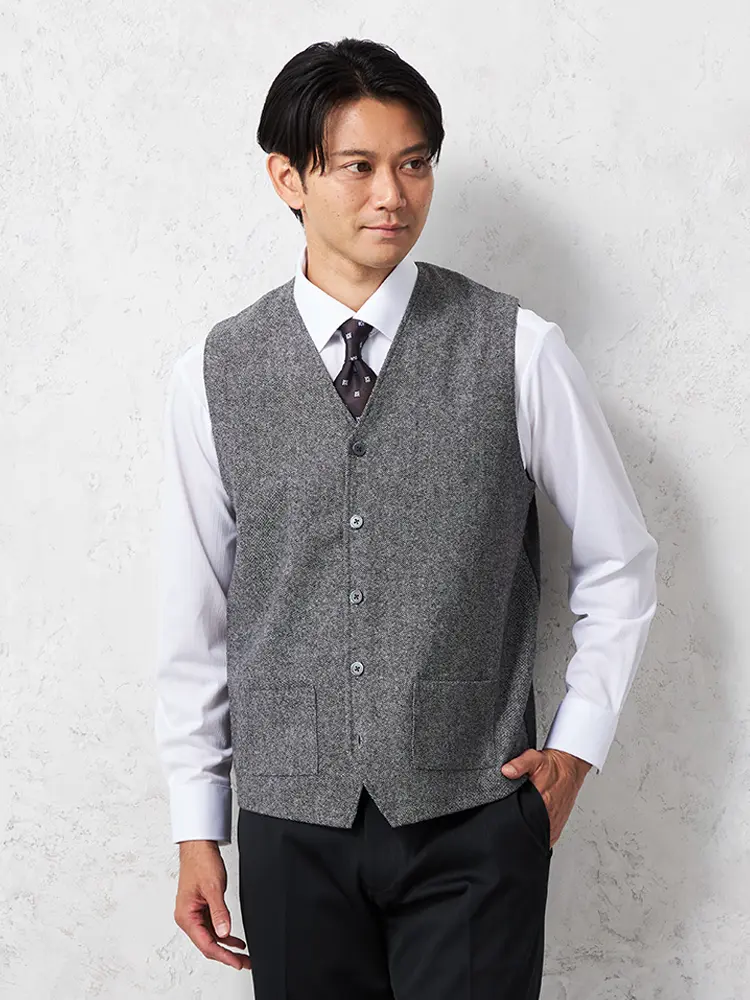 【ウォッシャブル】ヘリンボーン柄ニットジレ放電抗ピリングヘリンボンベストリッケンバッカー秋冬