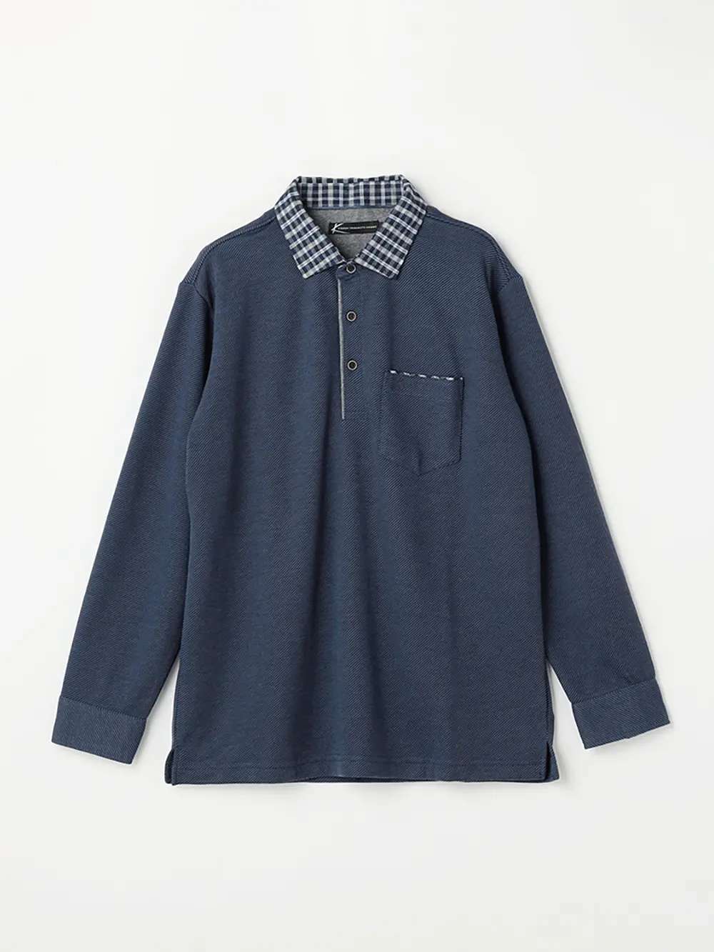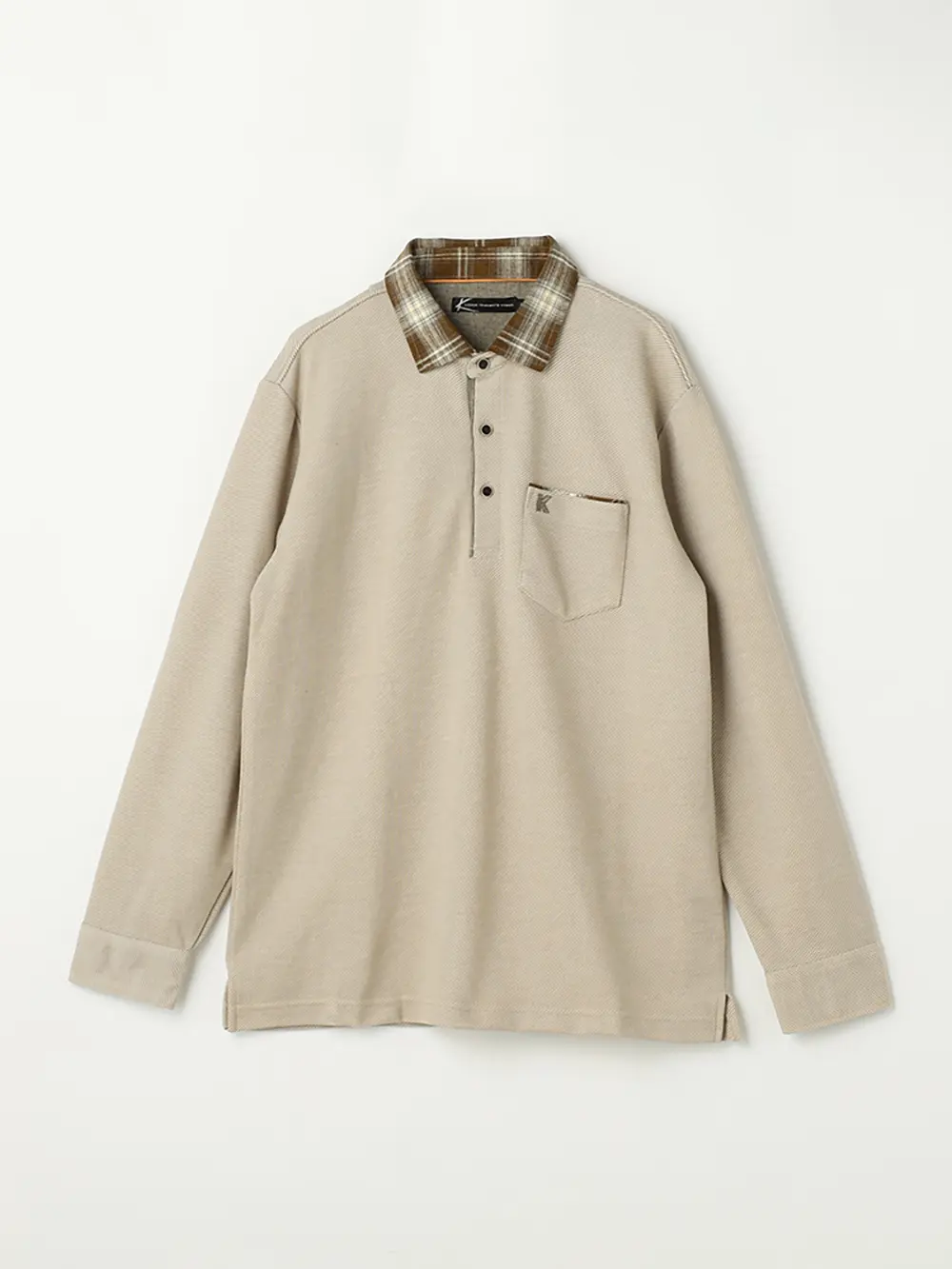 チェック柄の襟元や袖口裏が印象的な長袖のポロシャツ。