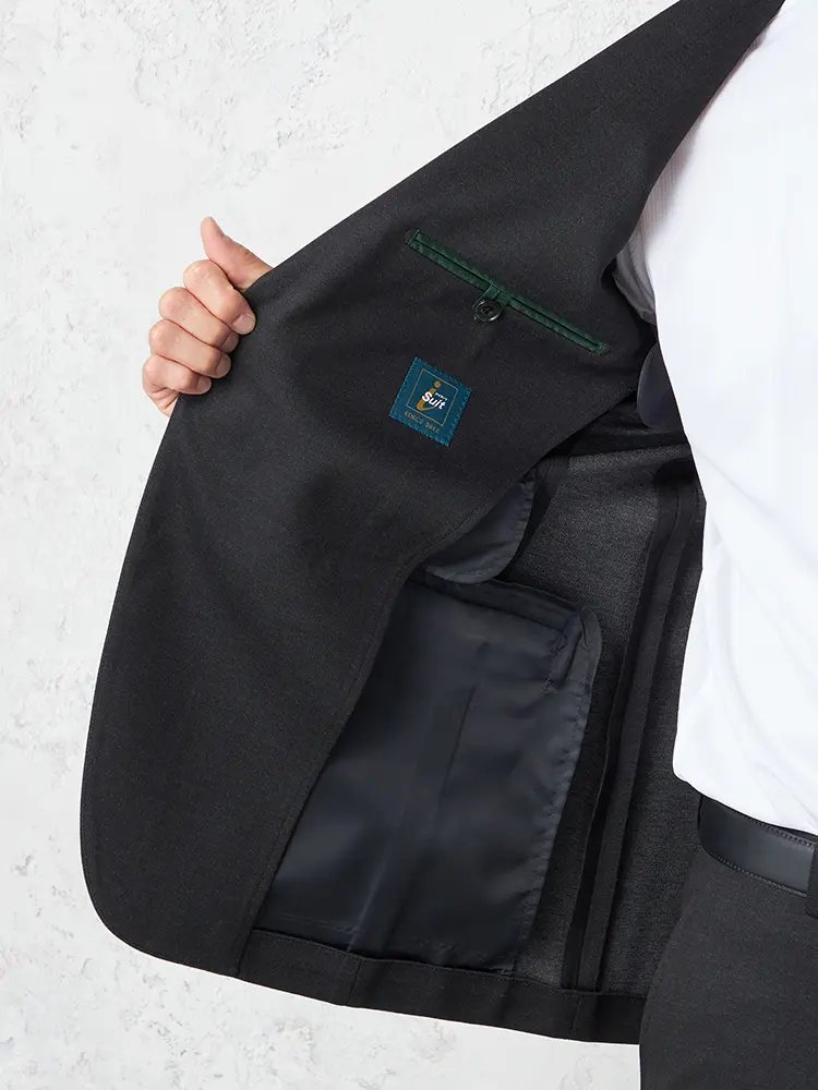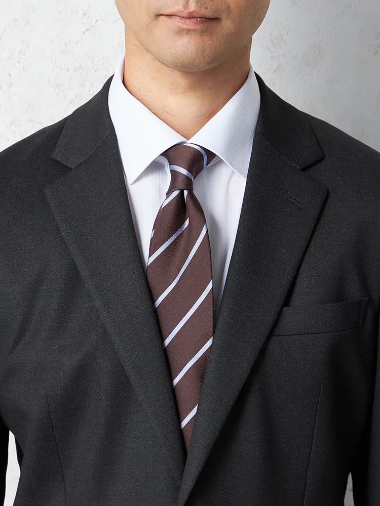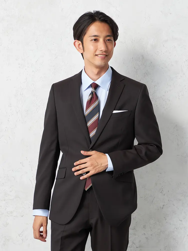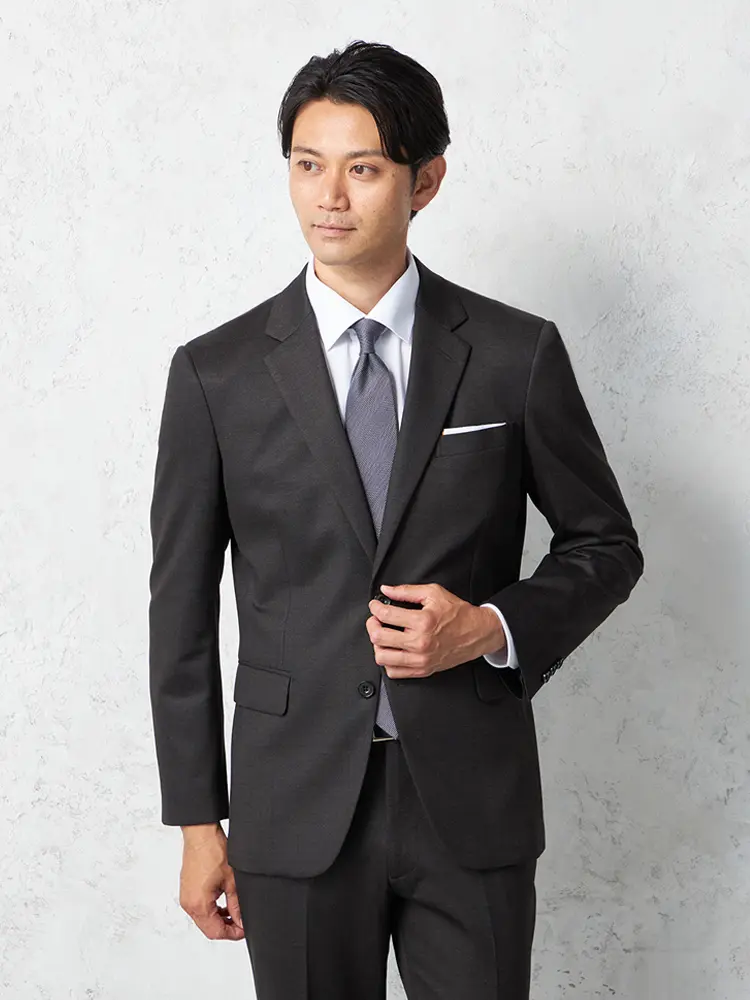 シックに着こなせる、落ち着いた色味のセンターベント、半裏仕立てのスーツ。