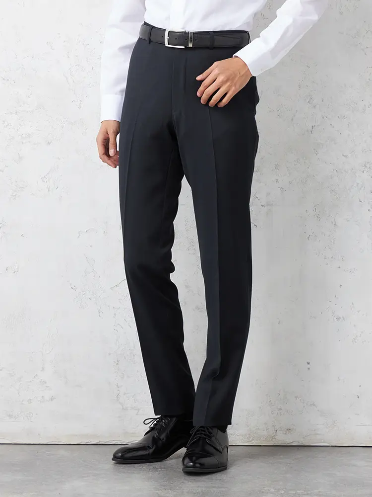 腰回りがすっきり見えるノータックパンツを採用しました。