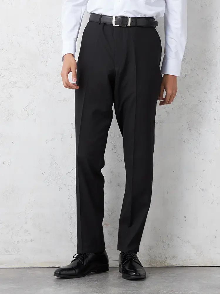 パンツの腰回りに生地の折り込みがなく、スッキリとしたシルエットを実現します。シンプルで洗練された印象を与え、すっきりとした着こなしが可能です。