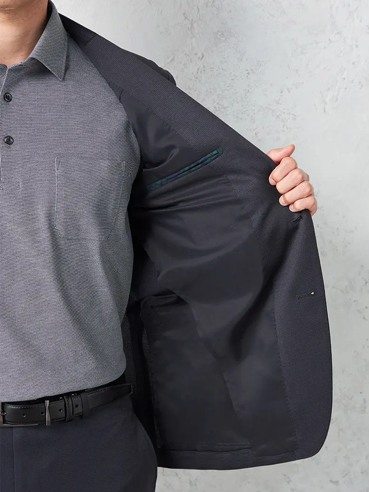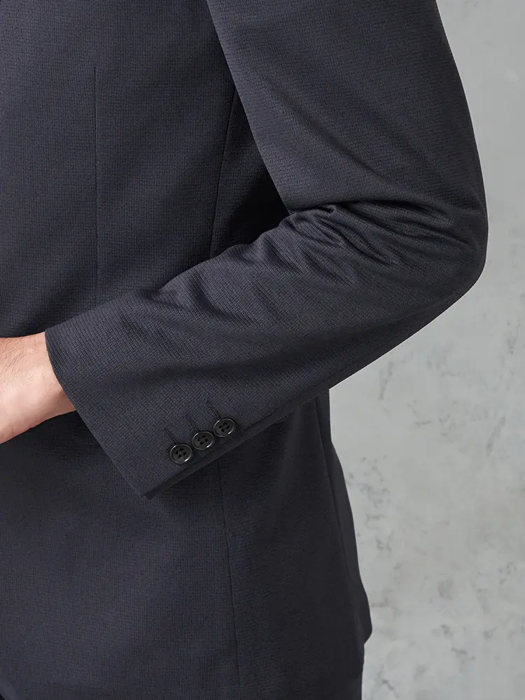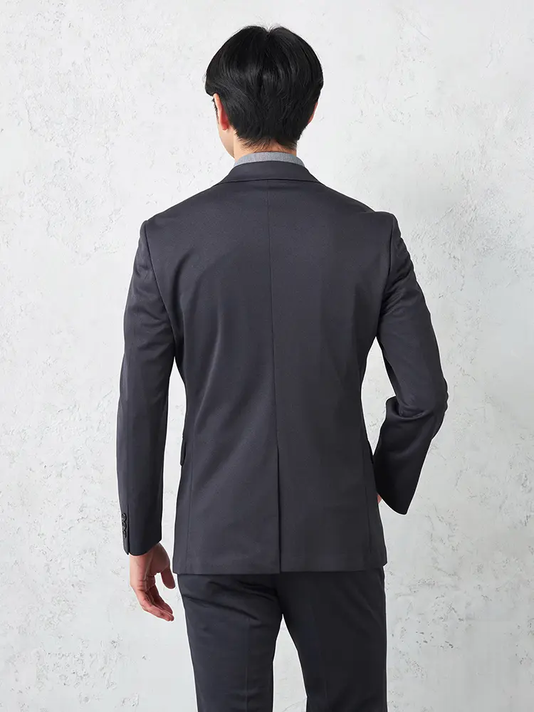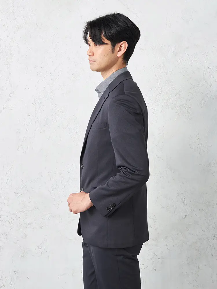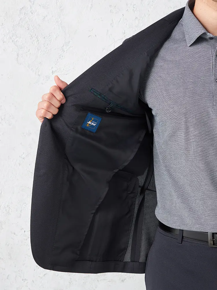 動きやすいストレッチ性を備えたニット素材を採用し、センターベントと半裏仕立てで軽快な着心地を実現。