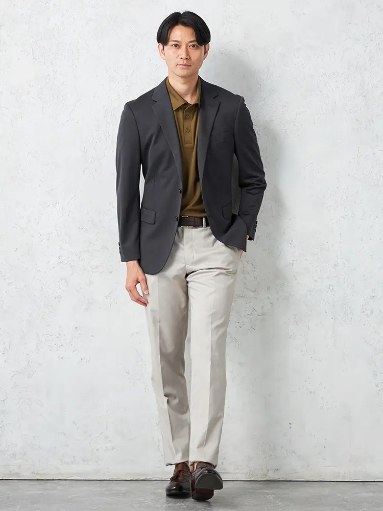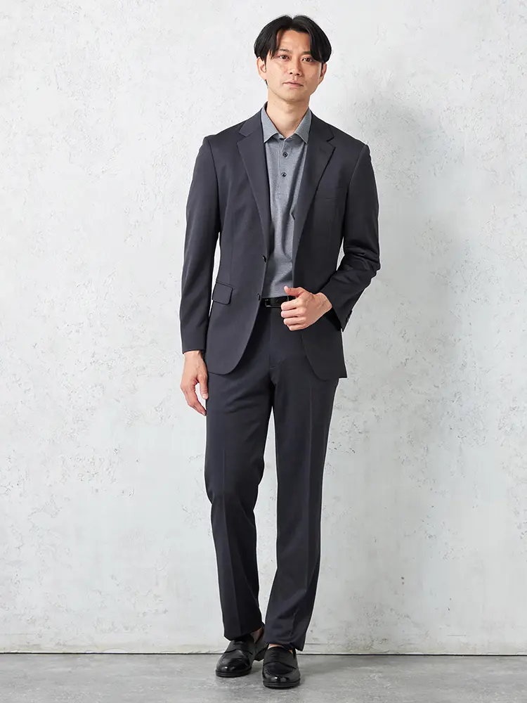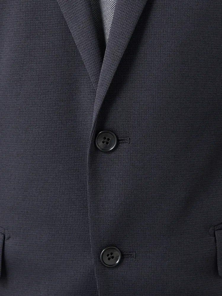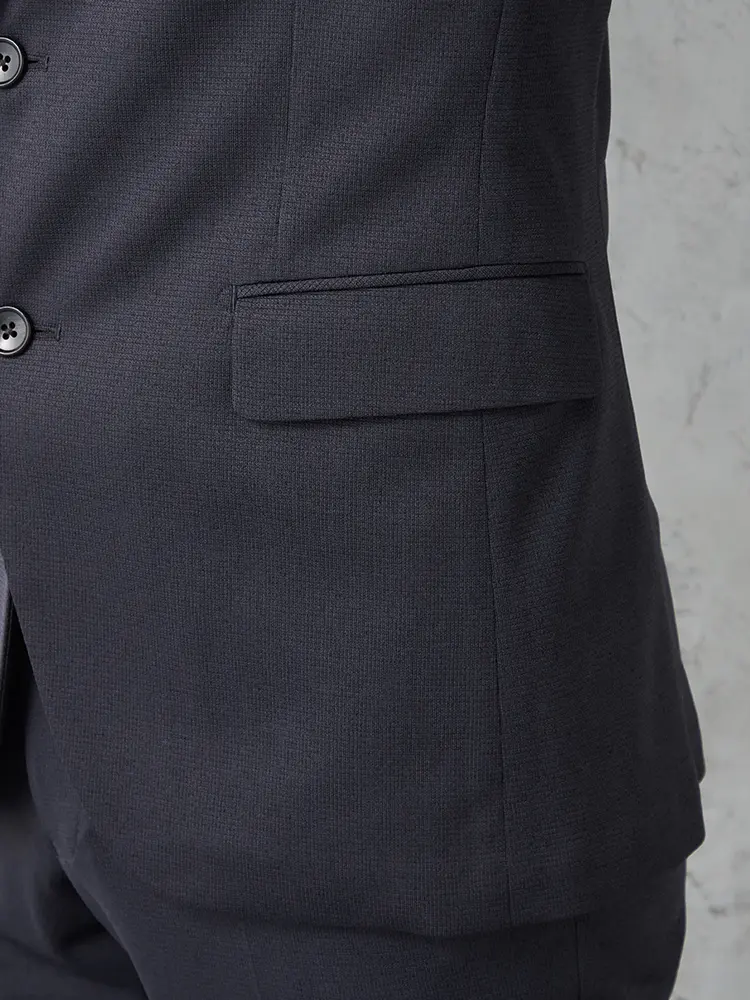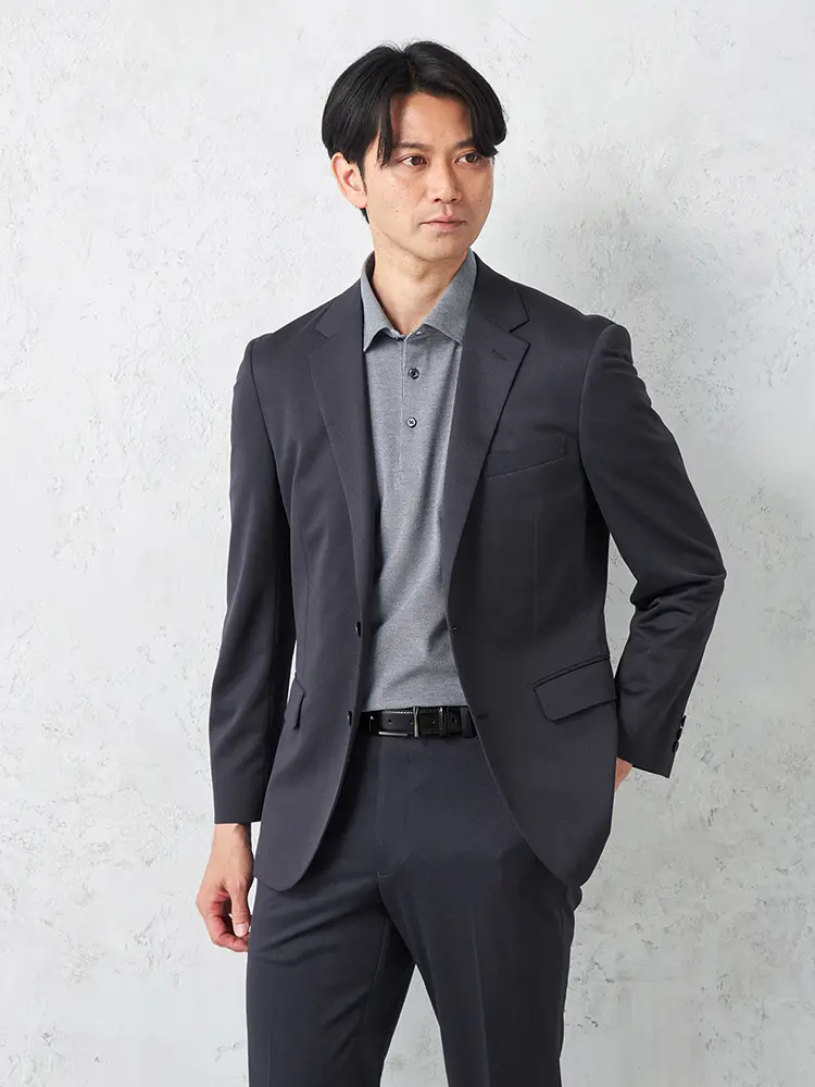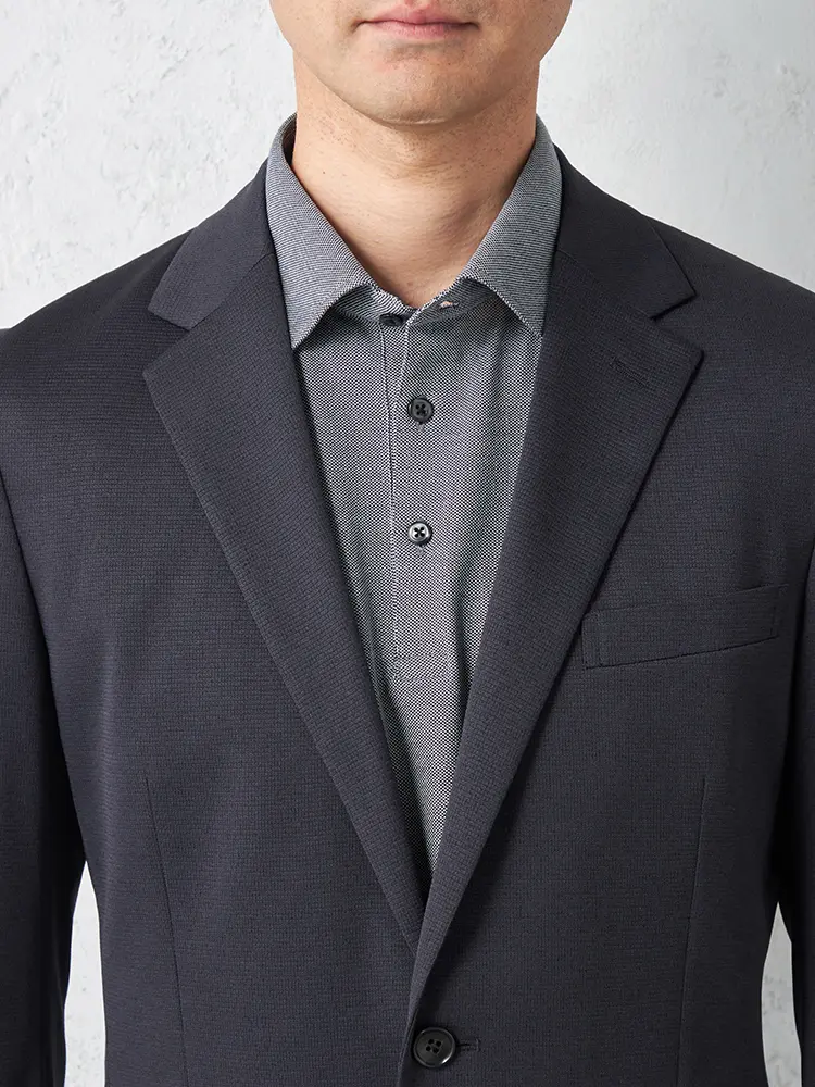動きやすいストレッチ性を備えたニット素材を採用し、センターベントと半裏仕立てで軽快な着心地を実現。
