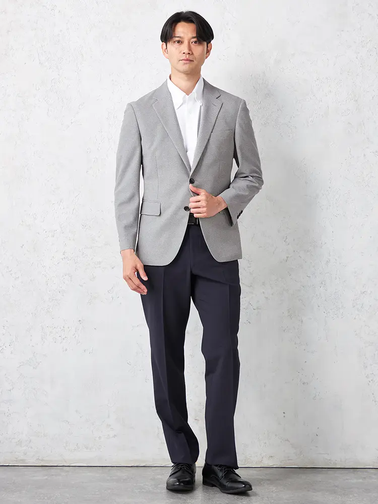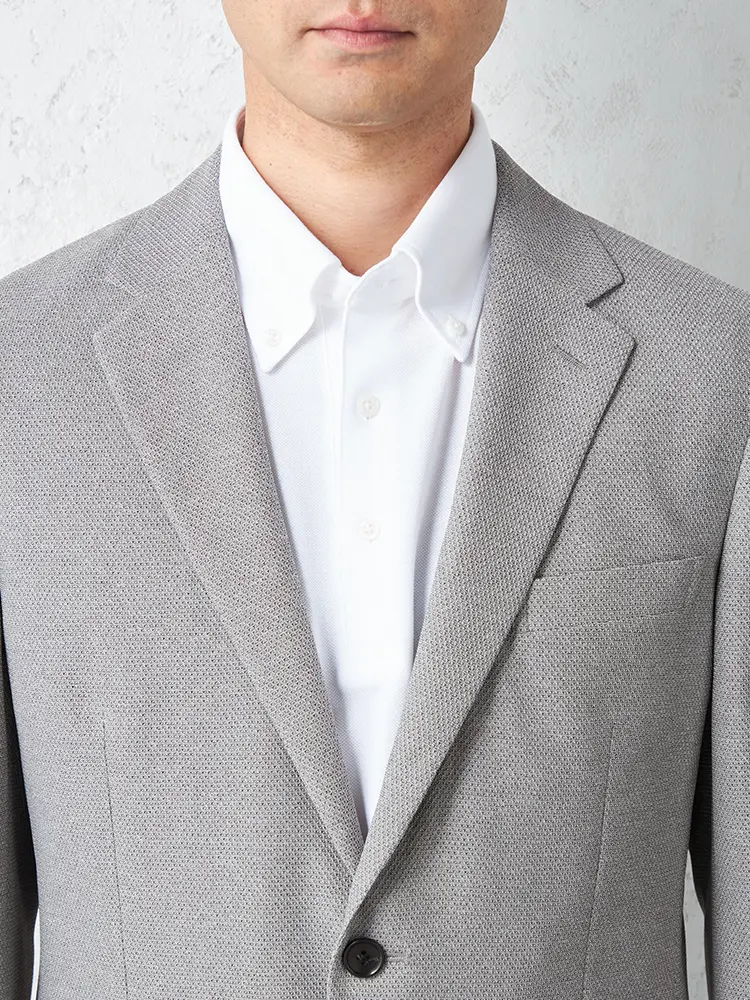 動きやすいストレッチ性を備えたニット素材を採用し、センターベントと半裏仕立てで軽やかな着心地に。