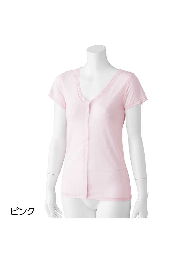 レディース吸水速乾ワンタッチ3分袖シャツ/婦人用/肌着/前開き/介護/入院/吸水速乾/抗菌防臭/春夏用【CF】